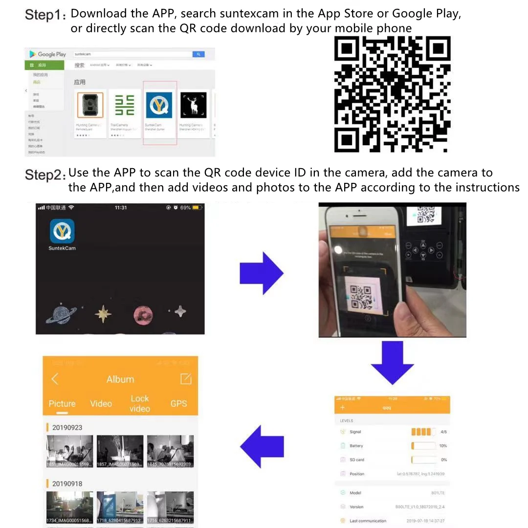 Шаг 1: Загрузите приложение, Найдите приложение SuntexCam в app Store и Google play или непосредственно отсканируйте qr-код, загруженный вами smartphoneStep 2: используйте приложение для сканирования идентификатора устройства qr-кода в камере, добавьте камеру в приложение, а затем добавьте видео и фотографии в приложение В соответствии с инструкциями