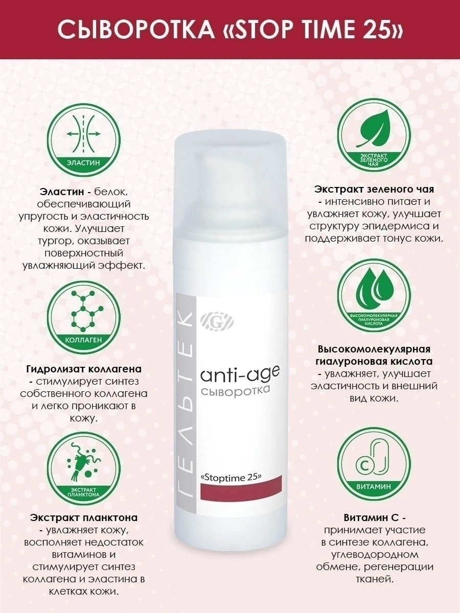 Гельтек Антивозрастная сыворотка для лица с эффектом лифтинга Stop time 25 с антиоксидантами и гиалуроновой кислотой, 30 мл