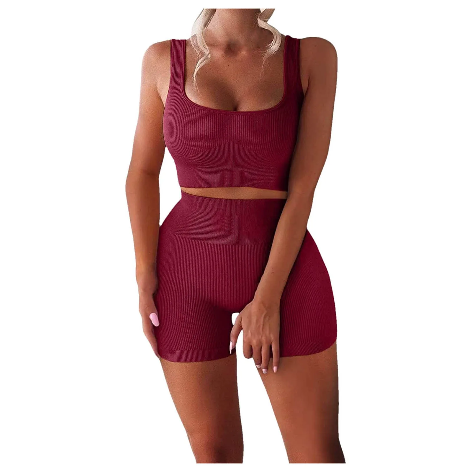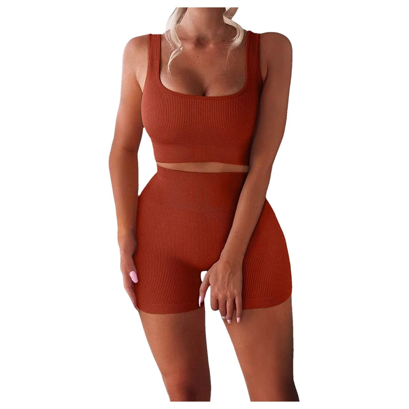 Женские Тренировочные комплекты из 2 частей Бесшовные ребристые бак высокого шорты с эластичной резинкой на талии одежды для йоги летний спортивный наряд Ribber и шорты в байкерском стиле