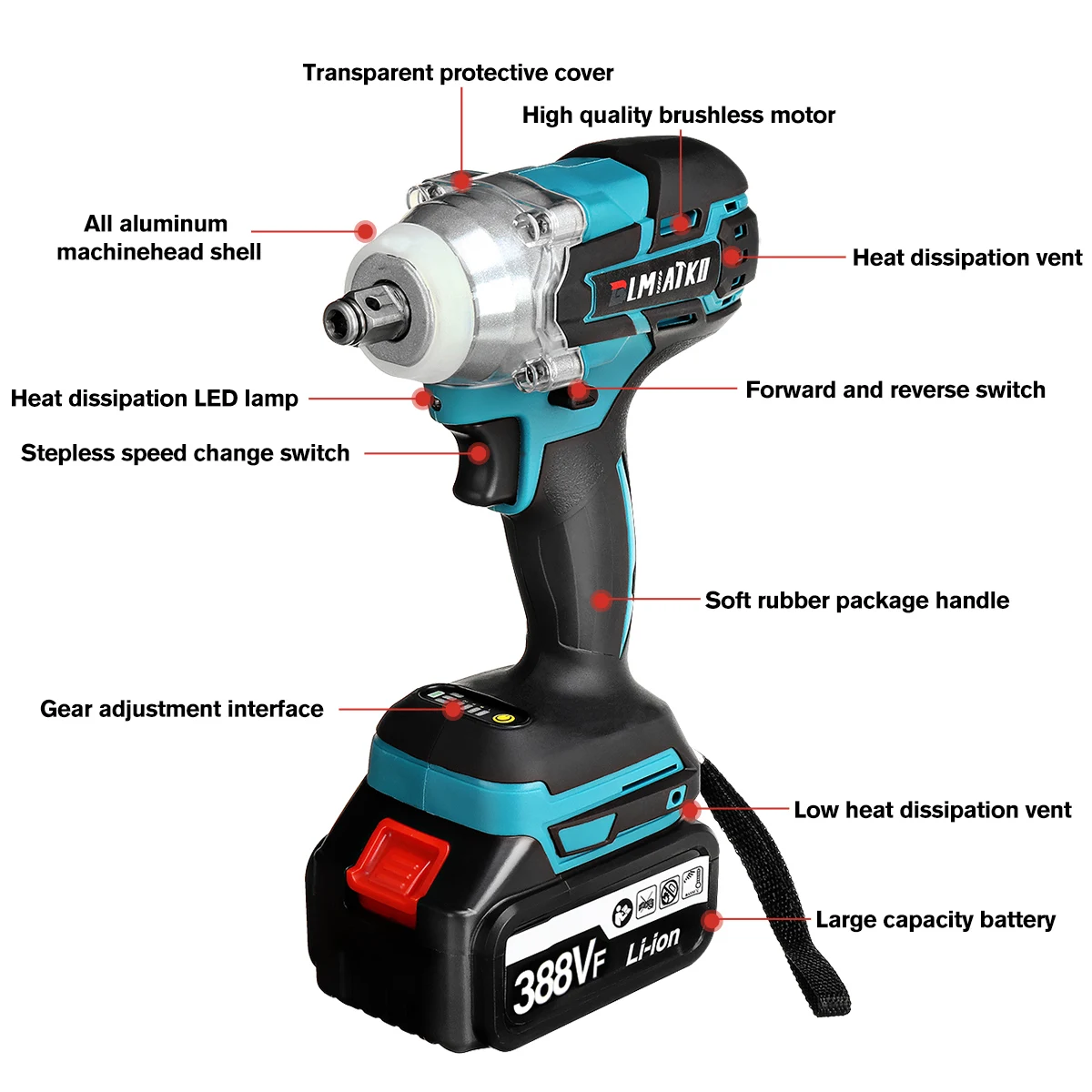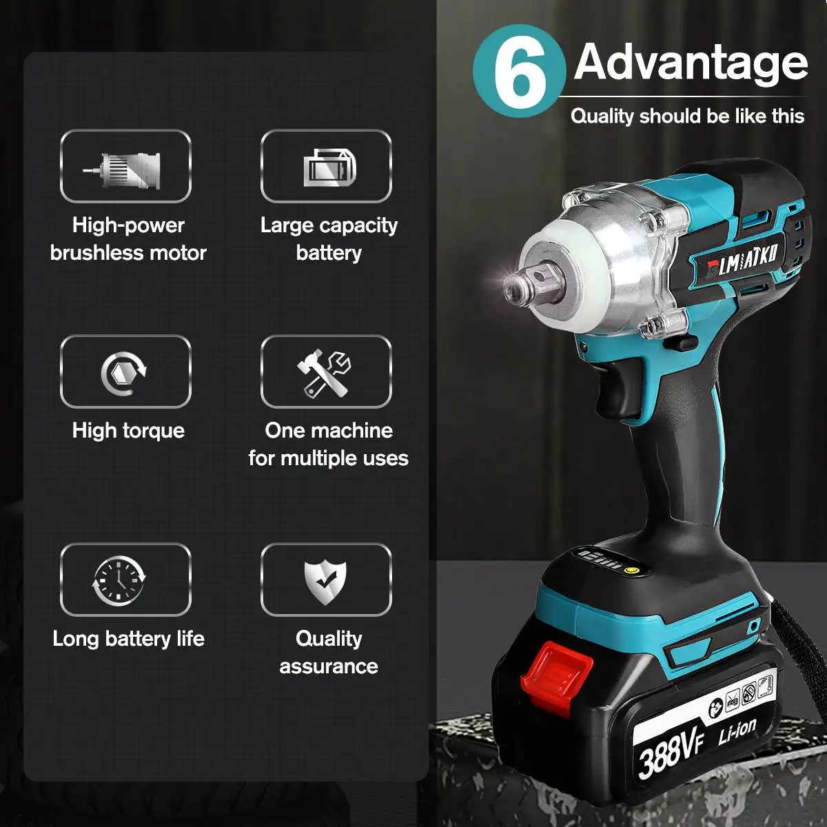 BLMIATKO обновления 4 Скорость бесщеточный Электрический Аккумуляторный ударный гайковерт 388V Перезаряжаемые 12 дюйма ключ, дюймовый стандарт Мощность инструменты с 2 Батарея