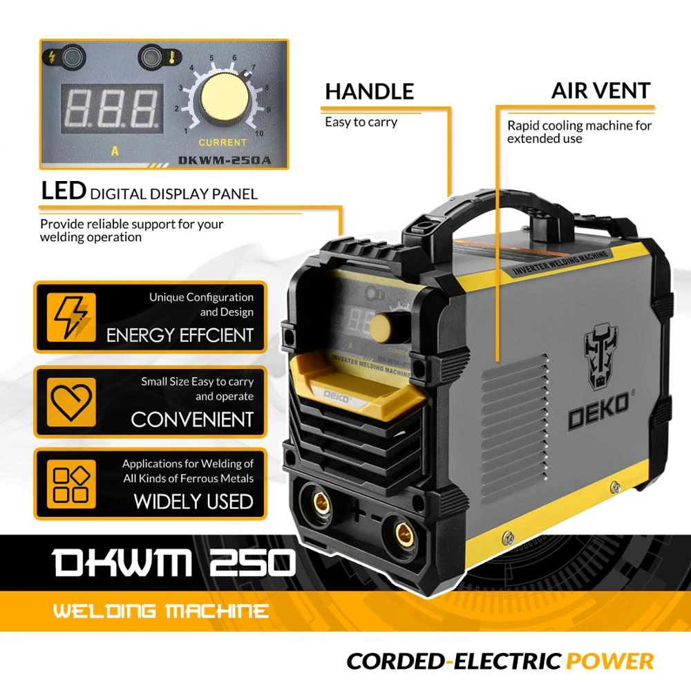 Сварочный аппарат 250А Deko DKWM250A – аппараты инверторного типа, предназначенные для ручной дуговой сварки (MMA) штучными электродами на постоянном токе. Область применения: в бытовых условиях (на даче, в гараже) и различных мастерских. Инверторы Deko оснащены плавным регулятором и индикатором сварочного тока, что позволяет точно настроить его показатели. ПреимуществаУсовершенствованная технология IGBT- Частота инвертора 20КГц, что позволяет уменьшить объем и весаппарата. - Низкий уровень шума во время работы аппарата. Режим управления- Управление с обратной связью, стабильное напряжение на выходе,адаптируемость к электрическим сетям (+-15%). - Настройка напряжения для соответствующей силы тока. - Контроль цепи, сварочной дуги, эффективность сварки. - Система автоматического гашения дуги подходит для различныхрежимов сварки. - Сварка в среде углекислого газа, либо в среде смешанных газов.