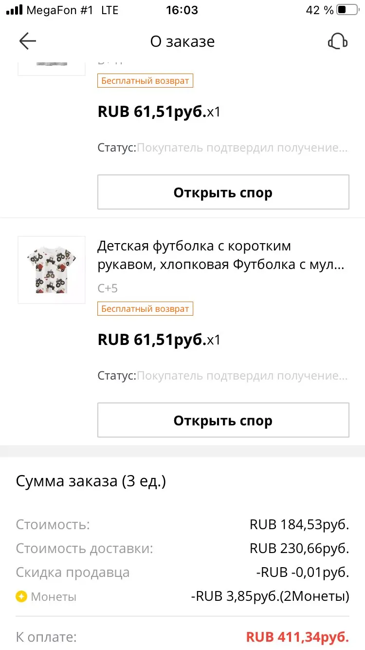 Быстрая доставка- 2 недели в область. В общей сложности заказала у продавца 4 футболки размеров 110 и 120. У всех качество норм. Материал х/б. Принты симпатичные, единственное осьминожка - наклейка, не знаю как будет после стирки. Футболки куплены на вырост, в стирке не проверяла. С купоном цена одной с доставкой вышла 140₽. Всем приятных покупок!