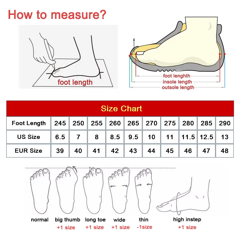 1. Американский размер илиCNРазмер может отличаться от вашей страны, поэтому, пожалуйста, выберите американский размер в соответствии с длиной Вашей стопы!