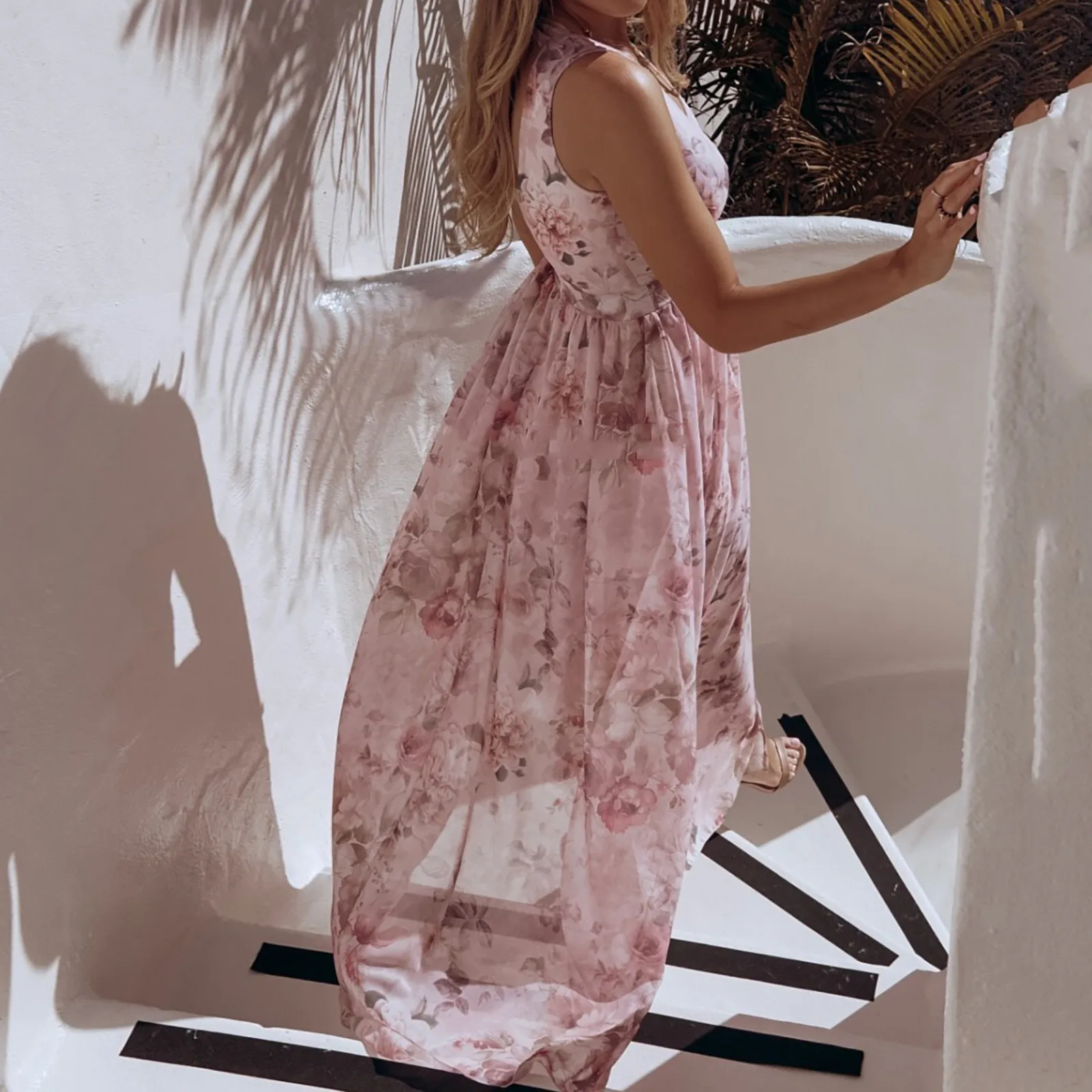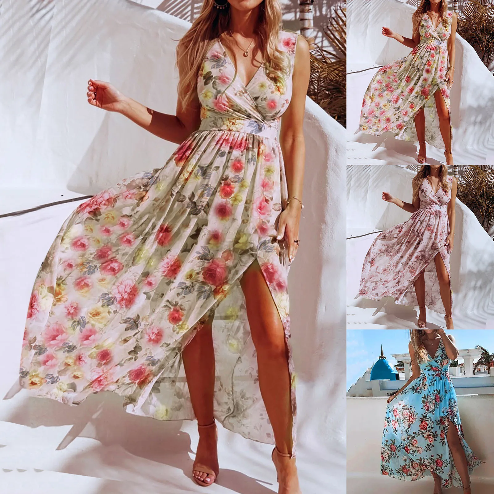 Женское платье в стиле бохо, голубое длинное платье макси с цветочным принтом и глубоким V-образным вырезом, Летний Пляжный вечерний сарафан, платья без рукавов