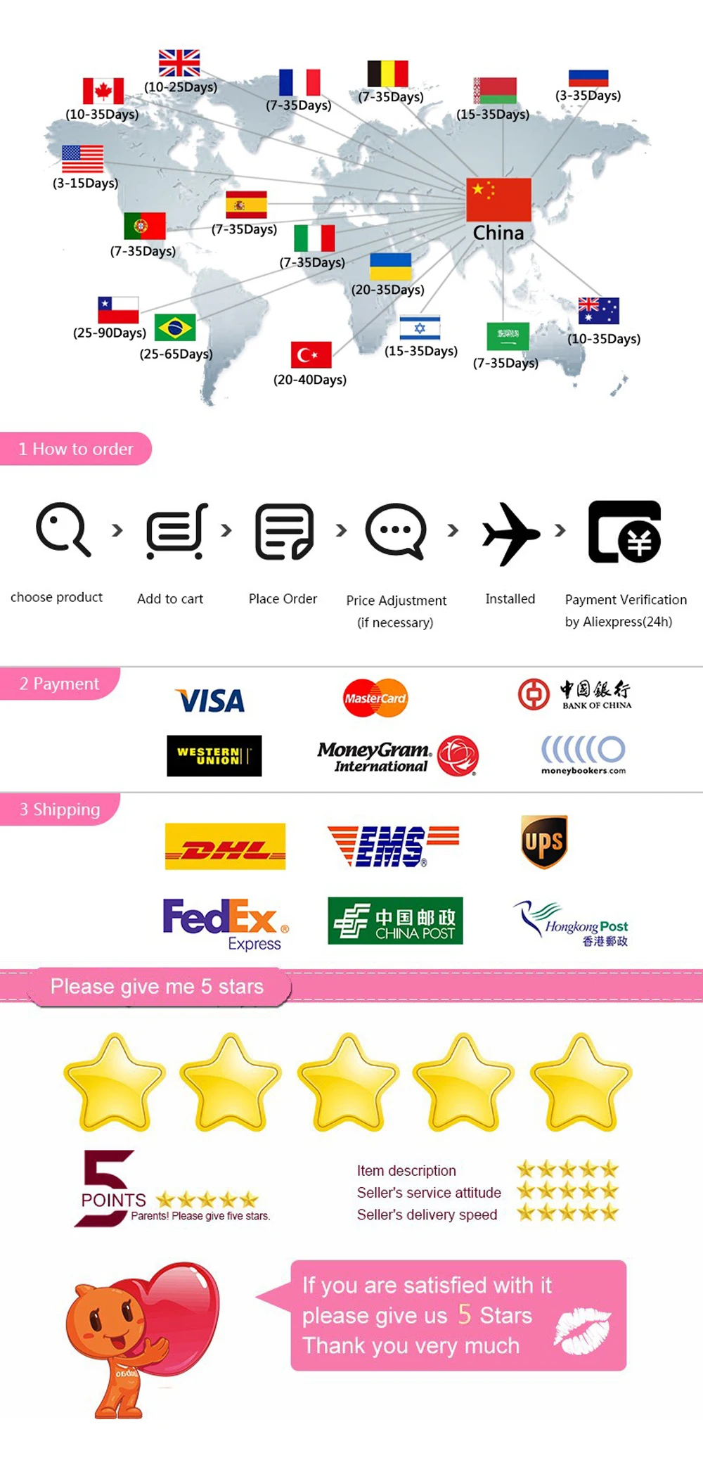 1. Вопрос: Есть ли скидка на громоздкий заказ?О: Да, мы можем предоставить оптовую цену. Если вам нужно больше или вы хотите индивидуальный продукт,Вы можете отправить нам электронное письмо или связаться с нами через Trademanager, мы ответим Вам в течение 24 часов(За исключением праздников).2. В: все фотографии настоящие?О: изображение всех товаров, которые мы продаем, является 100% реальной съемкой. Если вы хотите стать нашим агентом по продажам, вы можете сотрудничать с нашей компанией. И если вы продаете наши продукты и заказ достигает $500, вы можете получить реальное изображение высокой четкости.3. Вопрос: Как насчет качества продукции?О: Дорогой друг, пожалуйста, не беспокойтесь о качестве. Наша компания является основным производителем продукции в Китае, наша продукция экспортируется в более чем сто стран по всему миру. Наш технический персонал проверит все продукты, чтобы убедиться, что каждый клиент может получить продукцию высокого качества.4. Вопрос: Что делать, если я не доволен продуктами?Ответ: как только вы получили товар, независимо от того, какие у вас проблемы, пожалуйста, не стесняйтесь связаться с нами, мы постараемся сделать все возможное, чтобы решить вашу проблему, пока вы не будете удовлетворены.5. В: почему логистика так медленна в некоторые страны?О: все наши продукты имеют небольшую прибыль, и мы выбрали относительно экономичный и быстрый способ экспресс-доставки, обычно это занимает около 15-35 дней в большинстве регионов мира, для доставки требуется больше времени, пожалуйста, терпеливо ждите. Если вам срочно нужны наши продукты, вы также можете выбрать DHL,FedEx,TNT,UPS,EMS, но вы должны оплатить соответствующие логистические сборы. Надеюсь, вы понимаете. Спасибо.6. Вопрос: Как насчет вашей гарантии и послепродажного обслуживания?О: товары гарантированы на один полный год (проверка и ремонт услуг) с даты покупки, мы несем ответственность за любые поврежденные продукты (не поврежденные какими-либо факторами, сделанными человеком) И если проблема качества произойдет, мы обменяем поврежденный для вас. Тем не менее, вам может потребоваться вернуть поврежденный товар нам и оплатить стоимость доставки.Примечания: 1. Измерения выполнены вручную, допускается погрешность в 1-2 см, спасибо. 2. Пожалуйста, оставьте нам сообщение о предпочитаемом цвете, иначе мы отправим товар случайным образом. 3. Из-за разницы между различными мониторами изображение может не отражать фактический цвет изделия. Мы гарантируем, что стиль такой же, как показано на фотографиях. Пожалуйста, поймите, спасибо!