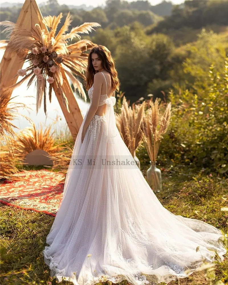 Летние свадебные платья в стиле бохо, кружевное Тюлевое платье в горошек с открытой спиной, свадебное платье, пляжные свадебные платья на бретелях в богемном стиле