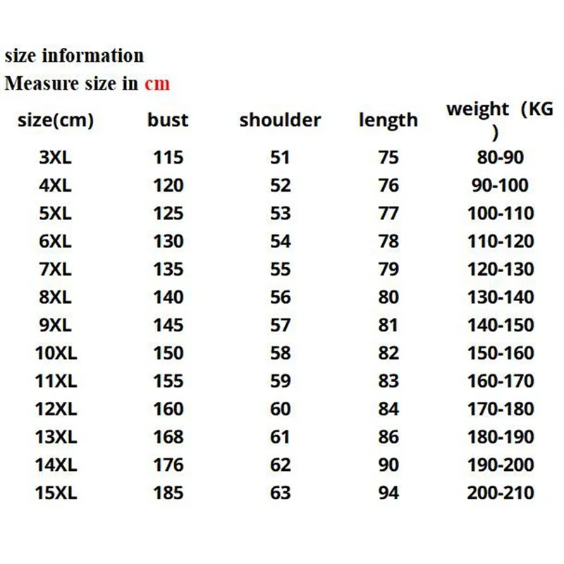 Размер (см) Бюст Плечо Длина Вес (кг) 3XL 115 51 75 80-90 4XL 120 52 76 90-100 5XL 125 53 77 100-110 6XL 130 54 78 110-120 7XL 135 55 79 120-130 8XL 140 56 80 130-140 9XL 145 57 81 140-150 1.0XL 150 58 82 150-160 11XL 155 59 83 160-170 12XL 160 60 84 170-180 13XL 168 61 86 180-190 14XL 176 62 90 190-200 15XL 185 63 94 200-210