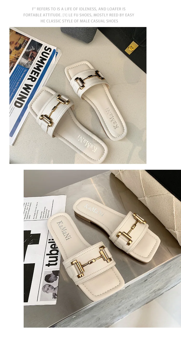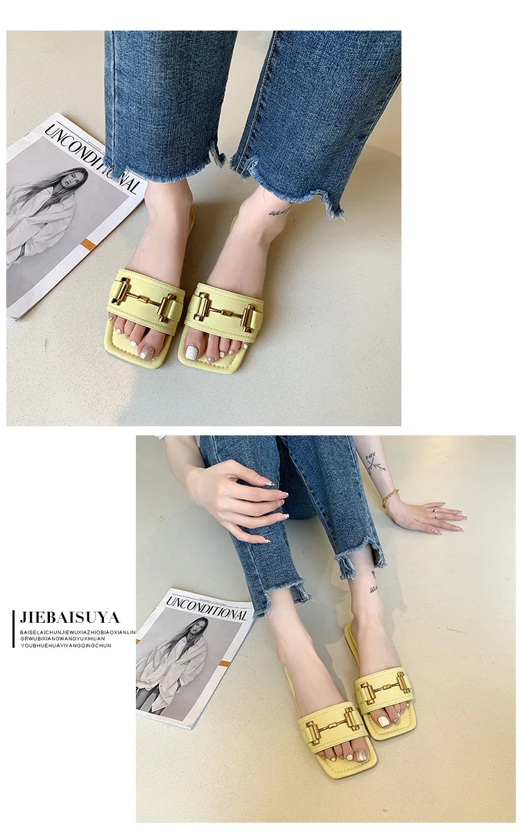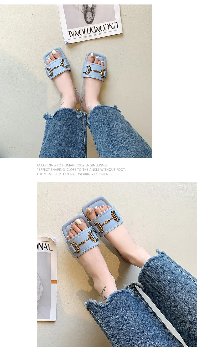 Женские повседневные шлепанцы, квадратные тапки на плоской подошве, с цепочкой, сланцы, модная обувь, 2021