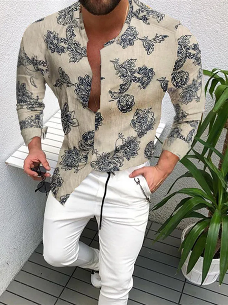 Мужская приталенная рубашка с длинным рукавом, с цветочным принтом