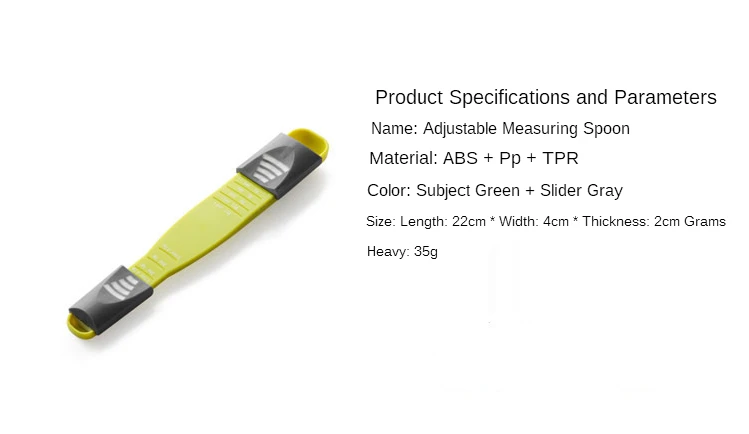 Название продукта: кухонная двойная головка восемь файлов Регулируемая мерная ложка Материал: ABS + PP + TPR Размеры: около 22*3,5*2 см Упаковка: 1 шт. Примечание: 1. Из-за ручного измерения размера возможны незначительные отклонения, пожалуйста, поймите! 2. Из-за того, что светильник для съемки и яркость дисплея отличаются, цвет немного, пожалуйста, поймите, спасибо!