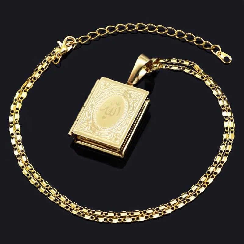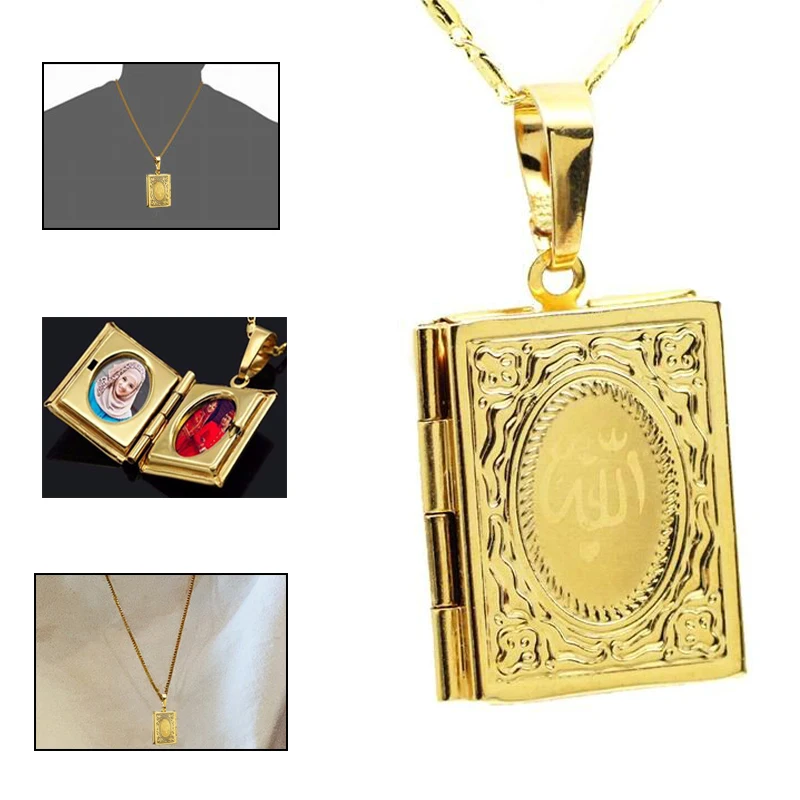 Золотистое мусульманское ожерелье с кулоном в виде книги Корана, ожерелье с фотографией, медальон, ожерелье, религиозная Исламская бижутерия