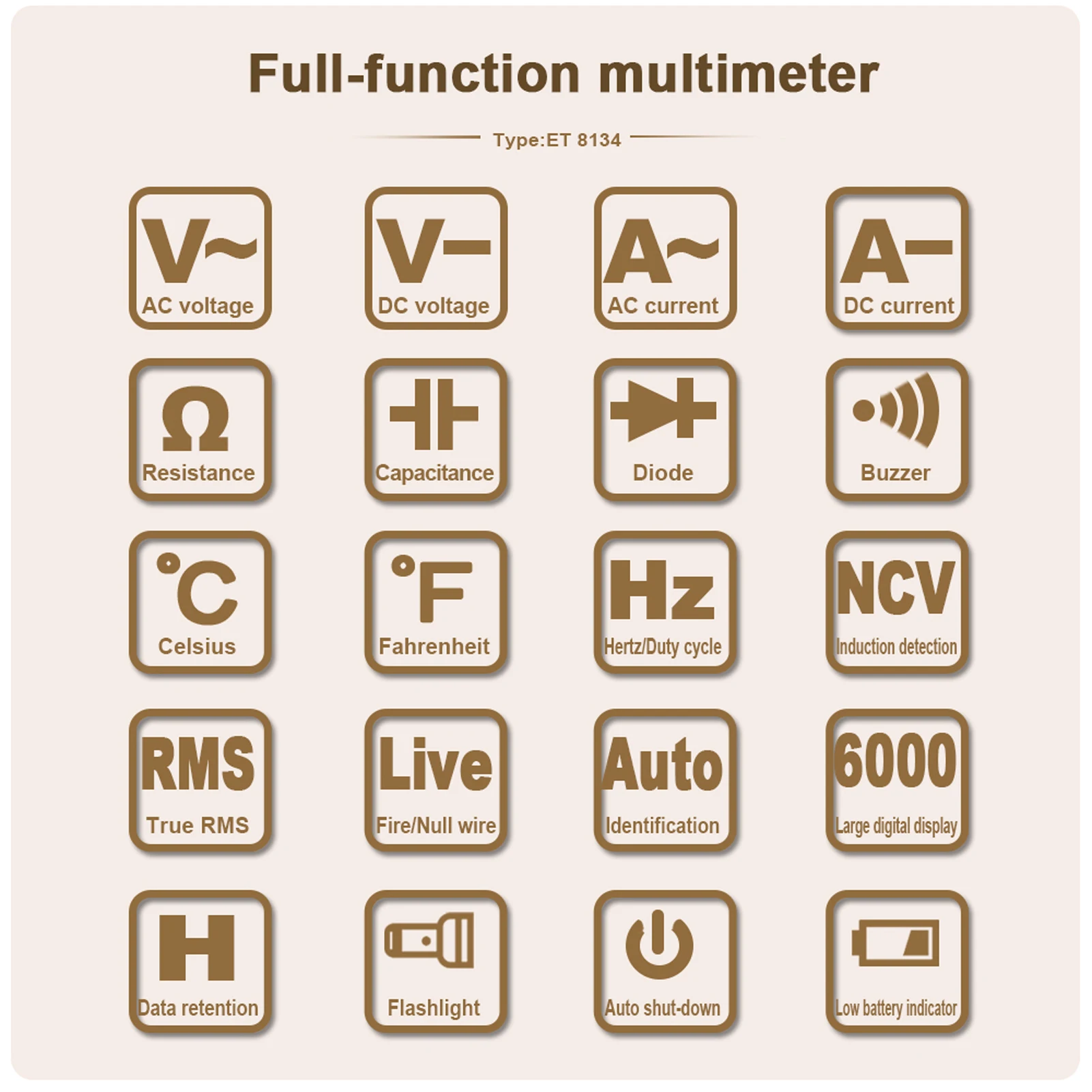 Многофункциональный: он используется для измерения напряжения переменного и прямого тока и тока, измерения емкости и сопротивления, бесконтактного напряжения и измерения температуры NCV, измерения диодов и непрерывности, распознавания проводов firewire и null.