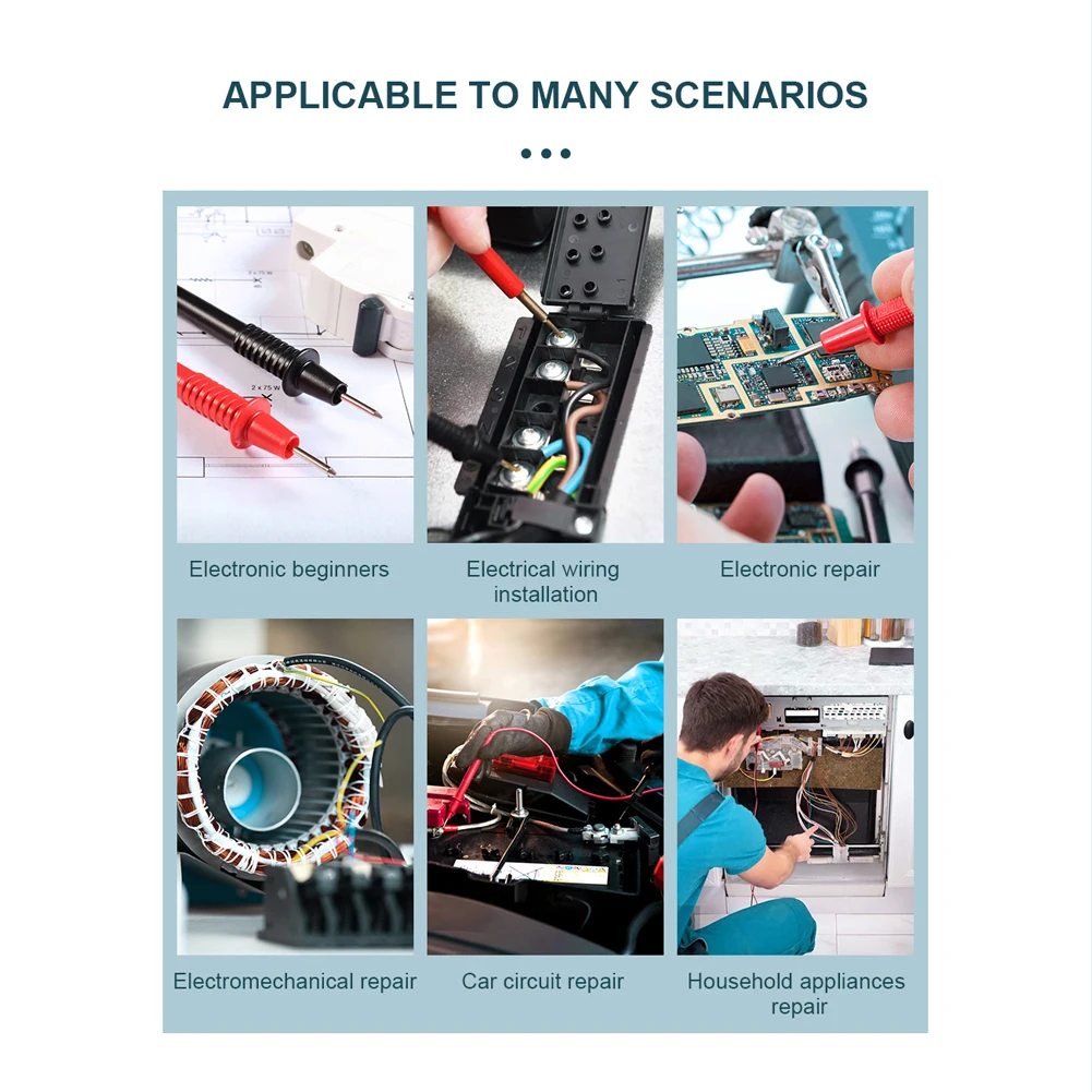 Широкое применение: Этот мультиметр является незаменимым для начинающих электронных устройств, установки электропроводки, электронного ремонта, электромеханической, автомобильной цепи и бытовой техники.