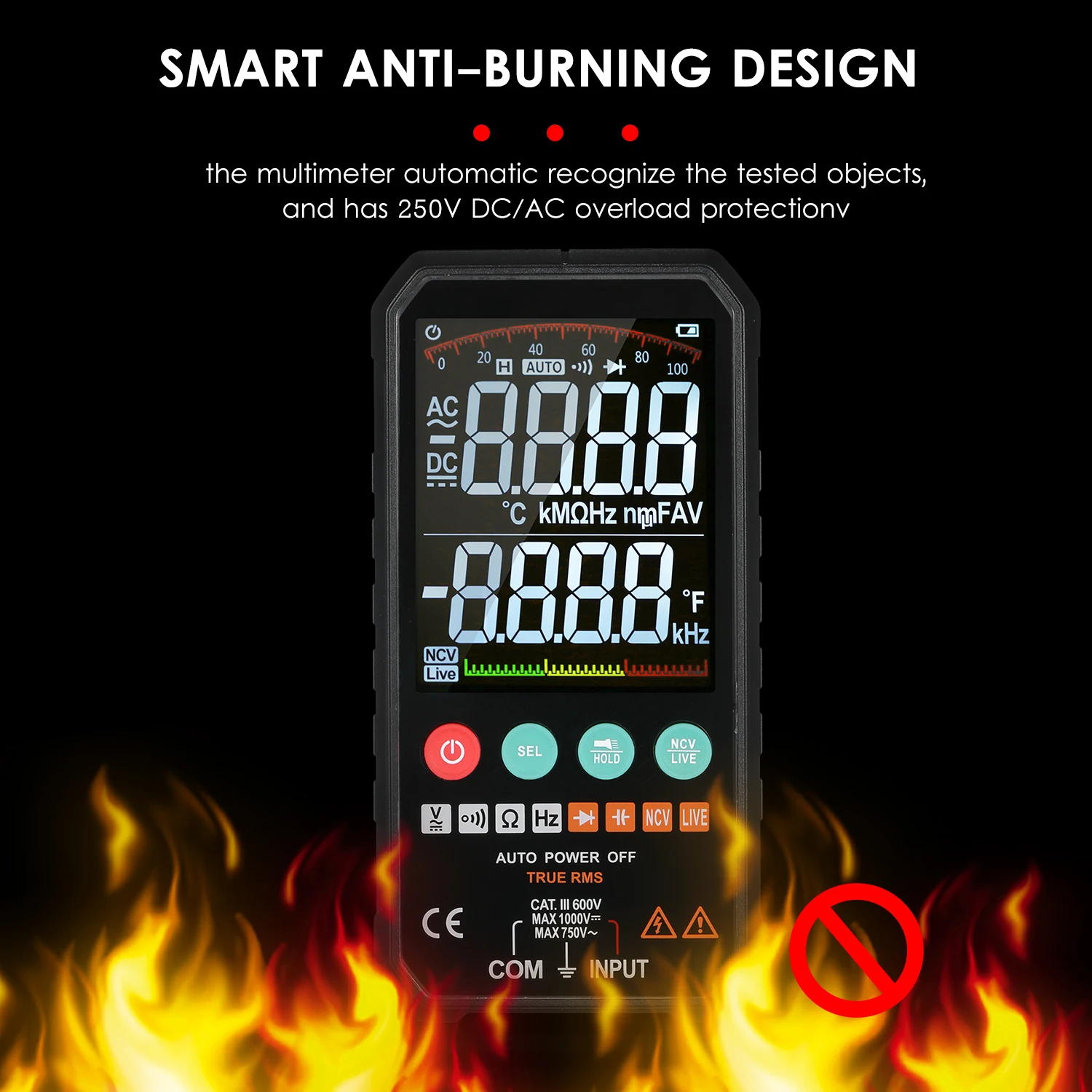 Умное измерение: он может автоматически распознавать напряжение постоянного/переменного тока, частоту, сопротивление, непрерывный зуммер без ручного переключения.