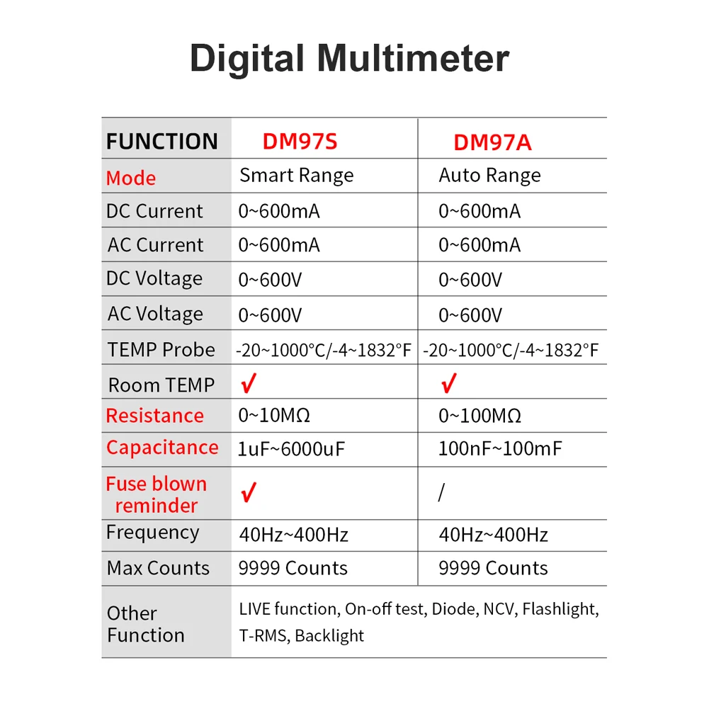 DM97A: ± (4,0 ~ 5.0% + 10 ~ 25)