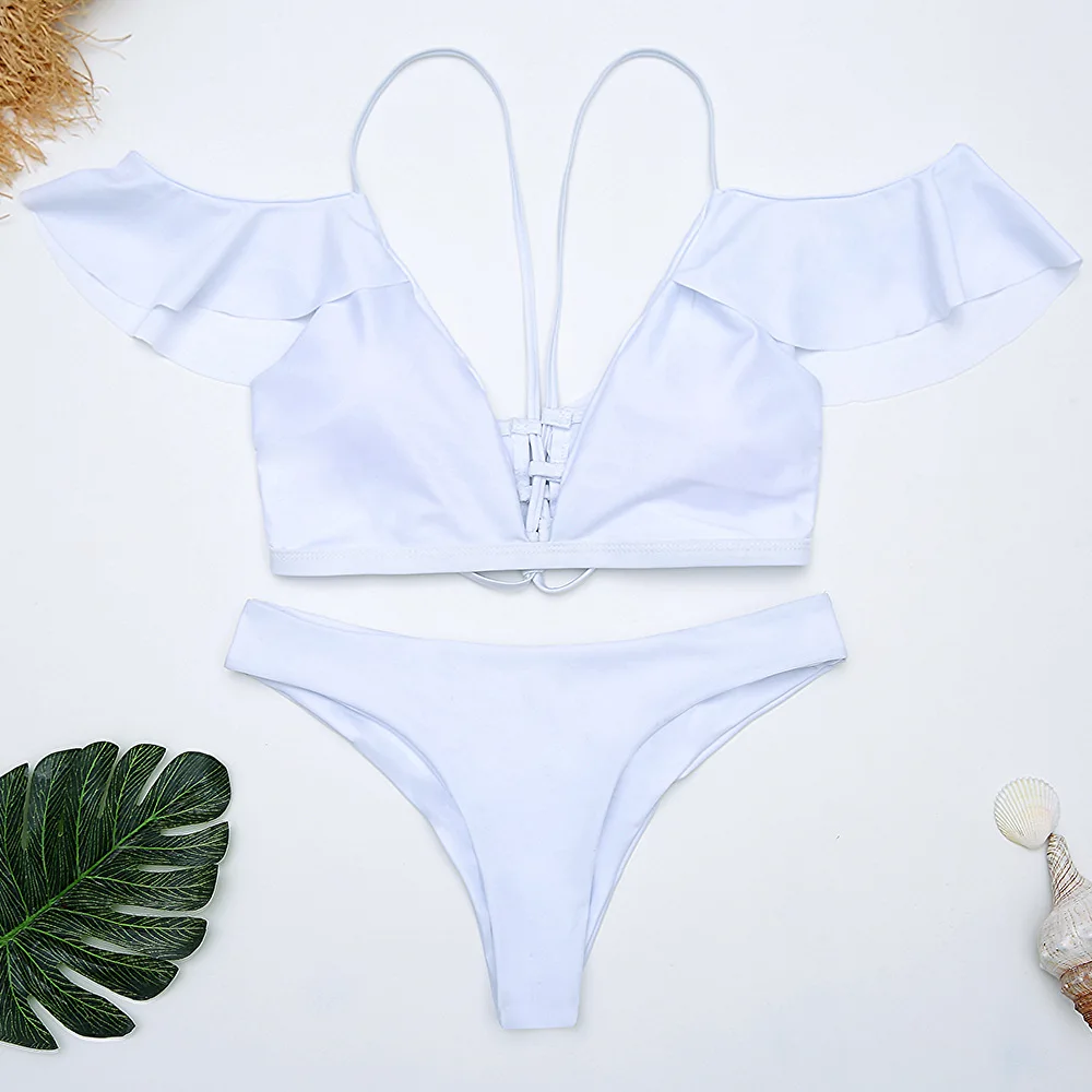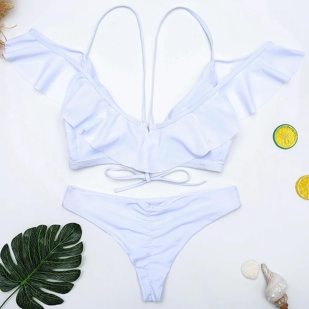 Новинка, женский купальник-КИНИ с оборками белого цвета, сексуальный женский пляжный купальный костюм бикини, купальник, спортивная одежда, бразильский купальник с эффектом пуш-ап