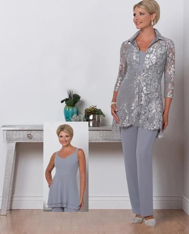 Платье для матери невесты серебристое с V-образным вырезом шифоновое кружевное с пиджаком и брюками Костюм длинные платья для матери жениха на свадьбу