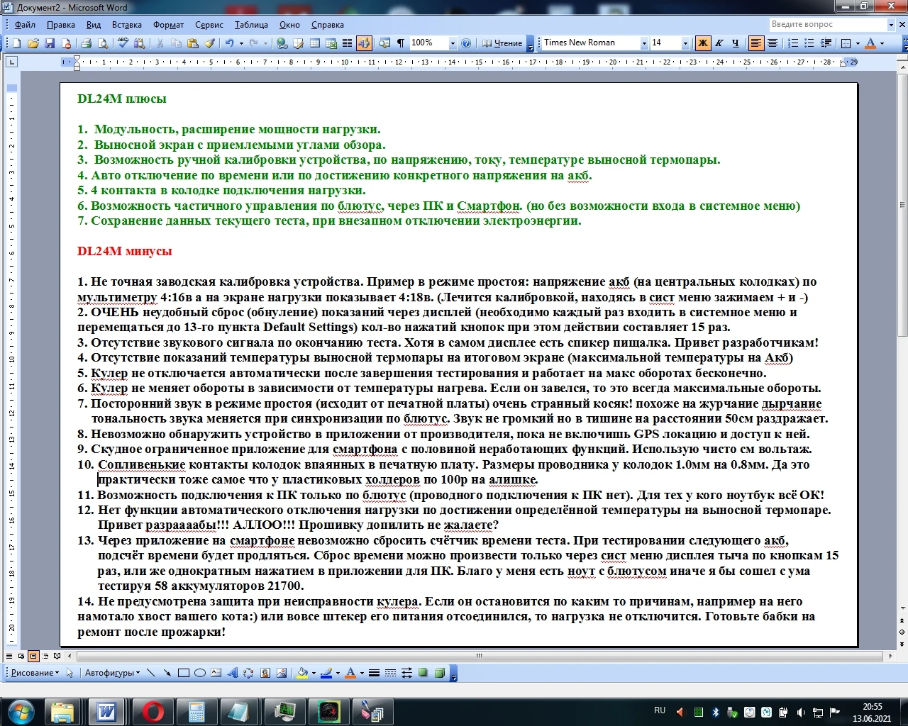 Брал для теста 58 ячеек Lii-40A на стрессоустойчивость к высоким продолжительным токам нагрузки. Всё протестил нагрузка осталась жива. Очень много нюансов у этого устройства! По напряжению не откалибрована! очень сырая прошивка по моему мнению. Все выявленные за два дня плюсы и минусы изложил на фото в скриншоте. Если алишка убьет качество фото и текст станет не читаемым, связь со мной канал China REVTV. Объясню что там написано. Возможно даже будет обзор на неё. Разрабы! допиливайте нормально софт и прошивку! Добавьте возможность отключения нагрузки по заданной температуре выносной термопары! И добавьте на финальный экран завершения теста, последнее максимальное значение температуры на термопары. И отключите кулер автоматически спустя 1 минуту после окончания теста!!! Какого хрена он крутит в простое???