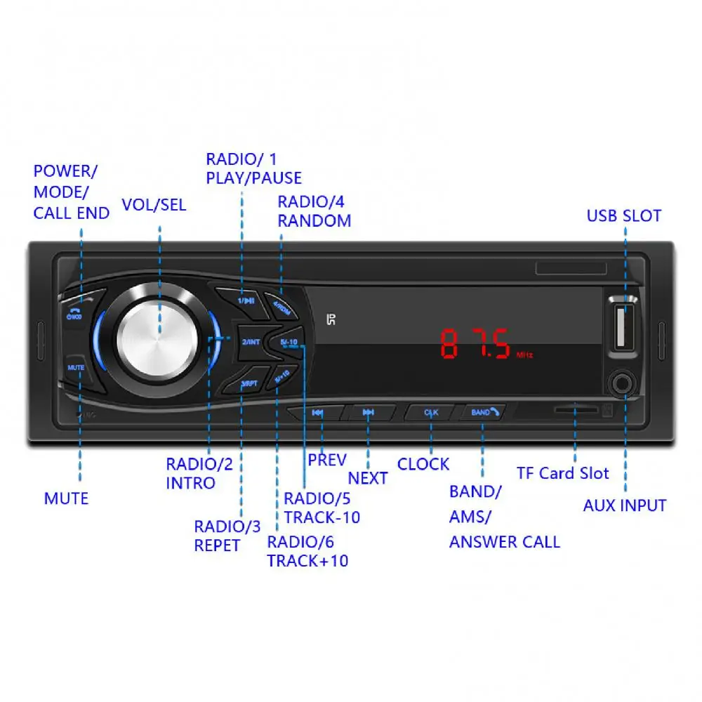 1030 12 в мощный универсальный FM-радиоплеер компактный совместимый с Bluetooth AUX U диск mp3-радио плеер для автомобиля центральное управление модификацияОписание:Поскольку он имеет несколько функций, вы можете использовать его, чтобы узнать последние условия трафика, услышать финансовые отчеты, слушать музыкальные передачи, или Получайте информацию или новости в реальном времени с помощью функции FM-радио. И вы не будете чувствовать себя одиноко, когда будете ехать один с сопровождением многих радиостанций.Поддержка функций Bluetooth-совместимого соединения, функция громкой связи, FM-радио, зарядки телефона, отображения времени, карты памяти, воспроизведения MP3 музыки, пульта дистанционного управления, USB чтения, AUX вход, отключение памяти и RCA-выход, Автомобильный MP3-плеер очень мощный.Автомобильный MP3-плеер, изготовленный из высококачественного пластика и металла, отличается прочностью и надежностью и хорошей защитой от царапин и коррозии.Длина автомобильного MP3-плеера-18,8 см, ширина-5,8 см, а высота-5,5 см.Он универсален до 12 в автомобильных транспортных средств и подходит для модификации Центрального управления автомобилем.Название товара: автомобильный mp3-плеерМатериал: пластик, металлБатарейки: пульт управления: Встроенный CR2025 150mAh (входят в комплект)Выходная мощность: 45 ВтСовместимость с Bluetooth: поддержкаНапряжение питания: 12 ВТип: 1030Модель чипа декодирования: TY3510Формат аудио: MP3Интерфейс USB: USB2.0Экран: цифровой дисплейПоддержка входа: AUX/TF карта/U диск/Bluetooth-совместимостьFM-радио частота: 87,5-108,0 МГцСлот для карт: TF-картаРадиомикросхема: Встроенный чипЧип усилителя мощности: YD1028Модель экрана светодиодныйВход AUX: ПоддержкаРазмер: 18,8 см x 5,8 см x 5,5 см/7.4inx2.28inx2.17inПримечания:Из-за разницы в освещении и настройках экрана цвет товара может сильно отличаться от изображений.Замеры сделаны вручную, поэтому возможны незначительные отклонения в размерах.Посылка входит:1 X Кабель Питания2 разборных детали1 пульт дистанционного управления1 X Руководство пользователя1 автомобильный mp3-плеер