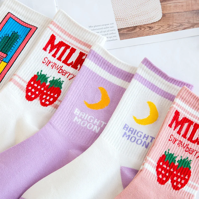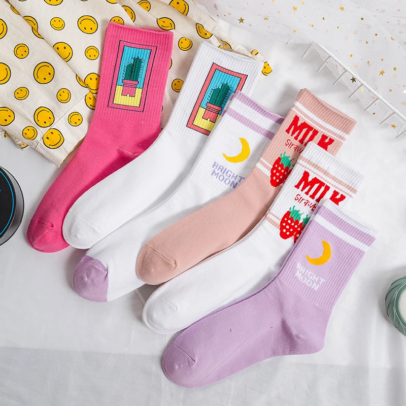 Носки женские хлопковые, разноцветные, с рисунком Луны, клубники, к...