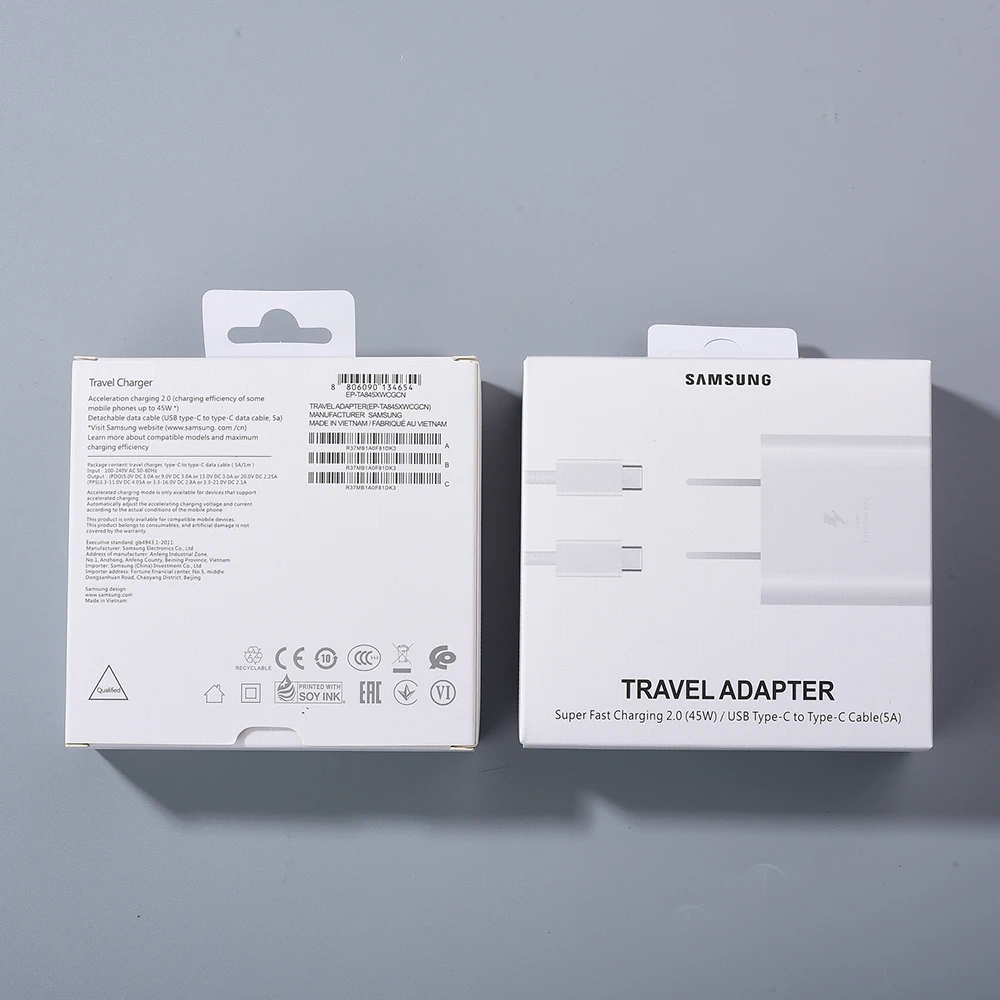 Особенности: 1. Название продукта: супер быстрое зарядное устройство (интерфейс Type-C) 2. Модель зарядного устройства: EP-TA845 3. Интерфейс: USB Type-C 4. Вход: 100-240 В переменного тока 50-60 Гц 1.2A (PDO): 5,0 V-3.0A или 9V-3.0A или 15,0 V-3.0A или 20,0 V-2.25A 5.(PPS) 3,3 ~ 11,0 V-4.05A или 3,3 ~ 16,0 V-2.8A или 3,3 ~ 21,0 V-2.1A 6. Вилка: ЕС/США Кабель USB Type-C для Type-C 7,100 см 5A 8. Розничная коробка