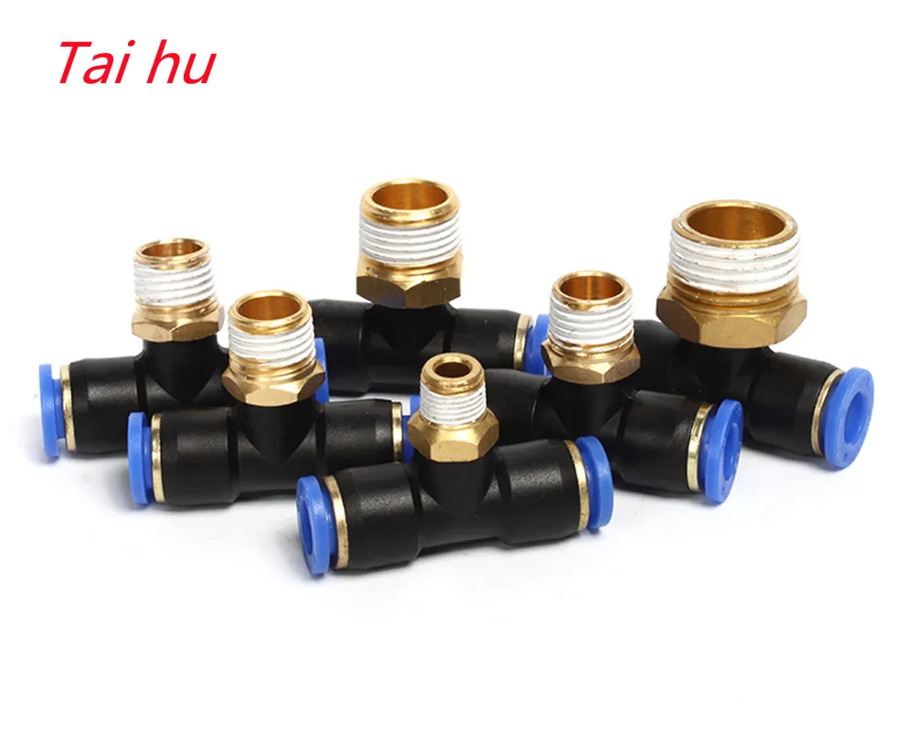 Т-образный штуцер воздушного соединителя, 6 мм, 8 мм, 10 мм, 12 мм, 4 мм, для шланга 18 дюйма, 14 дюйма, M5, 38 дюйма, 12 дюйма, пневматический штуцер с наружной резьбой BSPT, золотистый