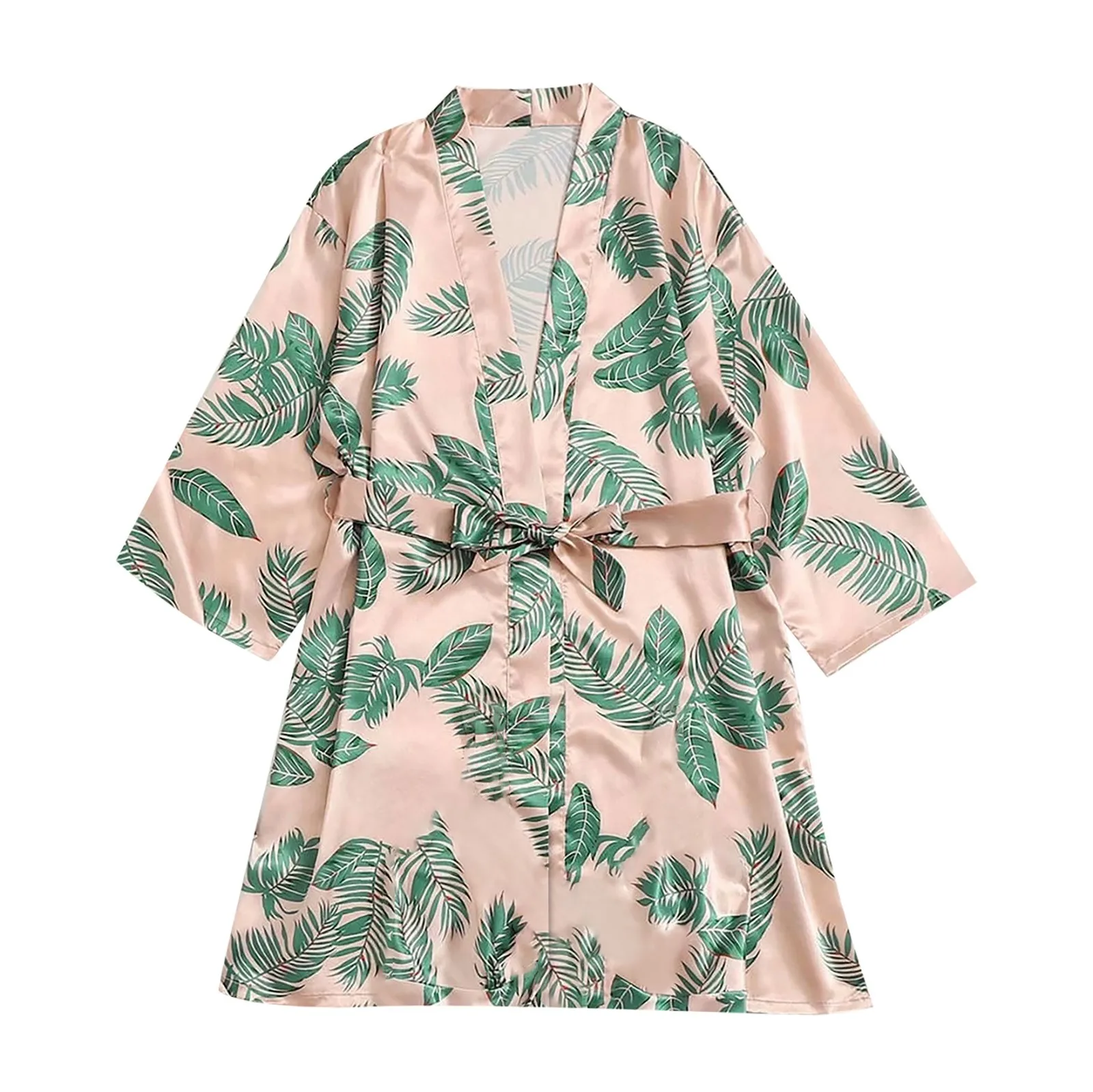 Женские халаты на весну и осень атласные шелковые пижамы женские халаты одежда для сна с принтом зеленых листьев халаты размер M *