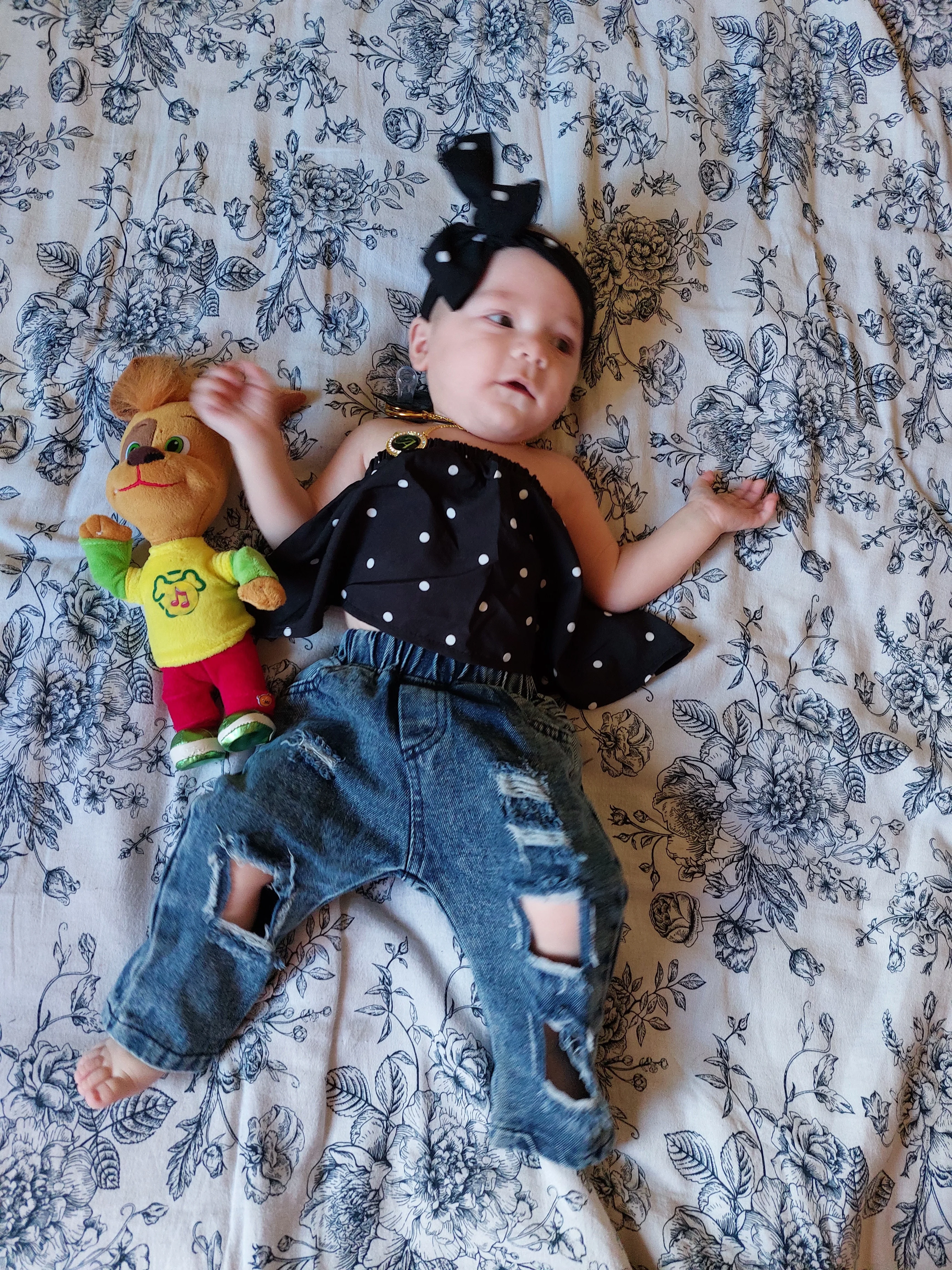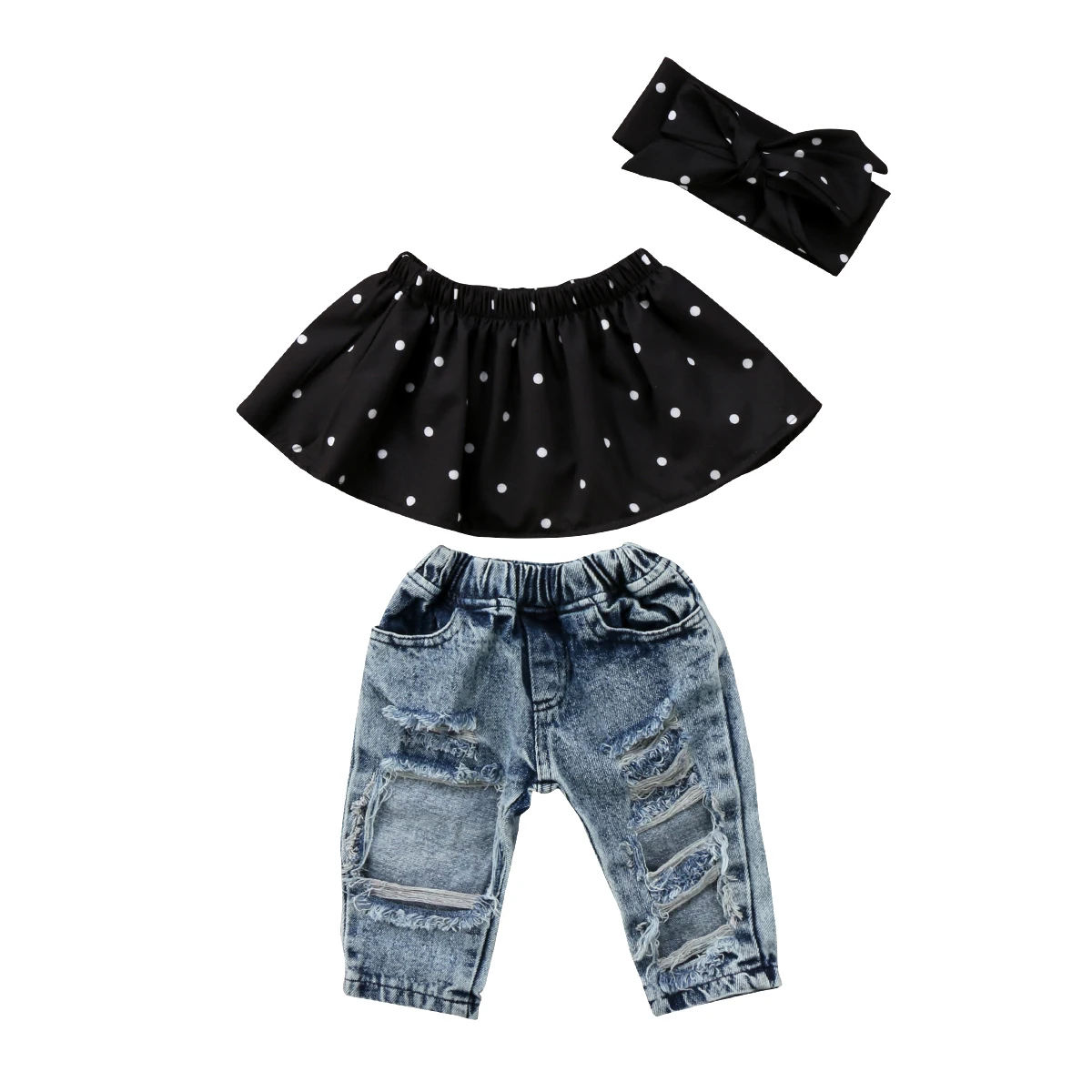 Комплект одежды для новорожденных девочек, топ в горошек без рукавов с открытыми плечами + рваные джинсы с повязкой на голову, летняя одежда для малышей 2021