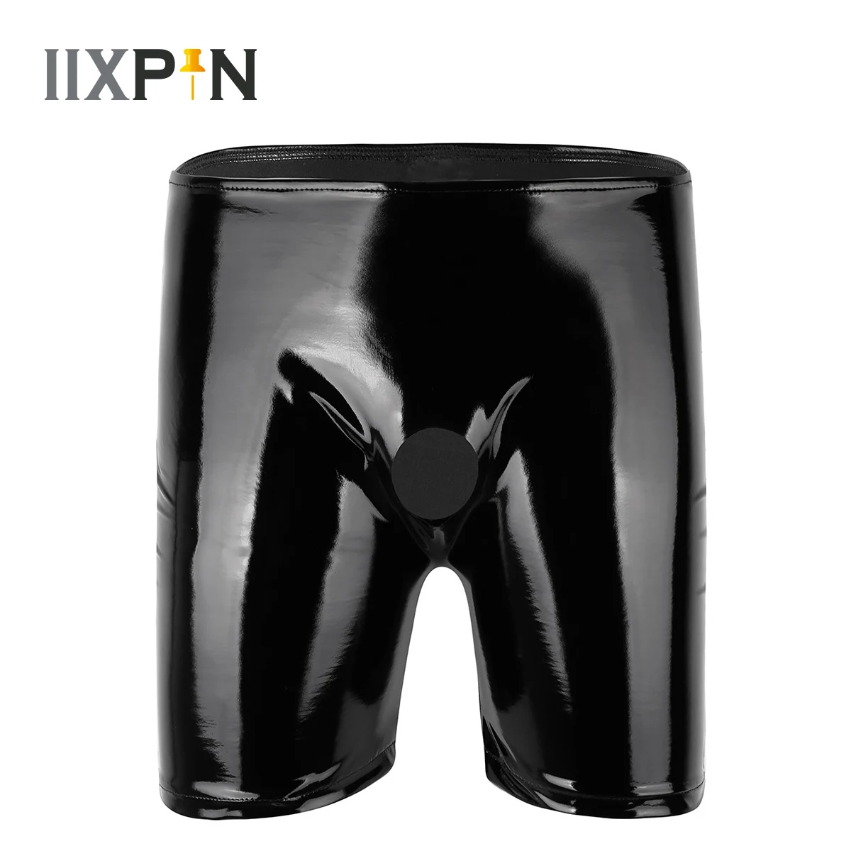 # M-XXL черные мужские блестящие лакированные кожаные с отверстием для пениса, Длинные трусы-боксеры