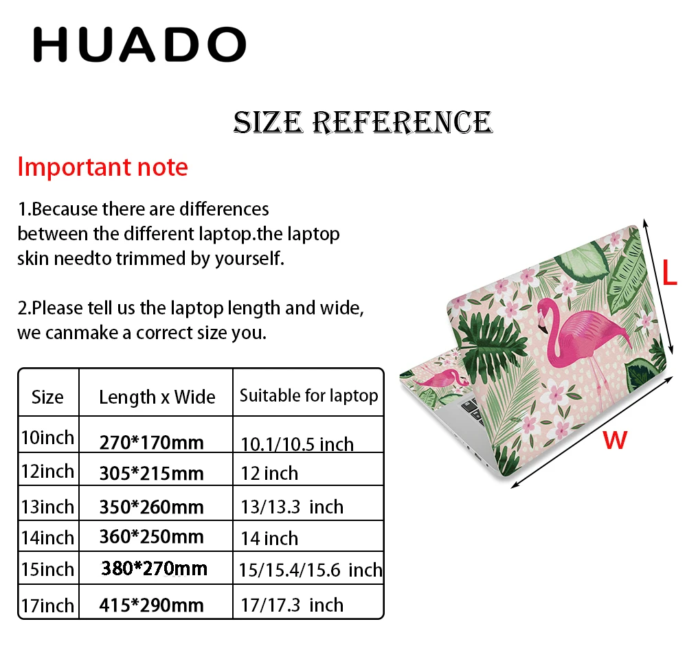 1. Beacuse существуют различия между разными ноутбуками, кожа ноутбука должна быть обрезана самостоятельно.10 дюймовый ноутбук кожи составляет около 27*17 см13 дюймов ноутбук кожи составляет около 35*26 см15 дюймовый ноутбук кожи составляет около 38*27 см17 дюймового ноутбука кожи составляет около 41,5*29 смИз-за ручного измерения возможна погрешность в 1-2 см.2. У этой кожи ноутбука есть 1 большая наклейка и 2 маленьких запястья.3. Мы осуществляем прямую доставку, и вы можете осуществлять оптовую продажу, большое количество отличной цены, добро пожаловать за помощь.
