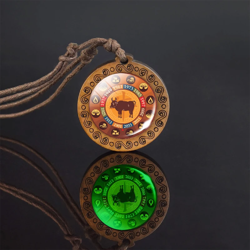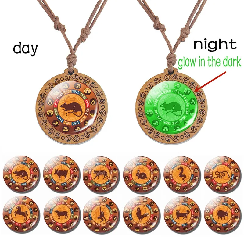 Китайский 12 знаков зодиака брелок ювелирное изделие, Знак зодиака Бык Тигр кролик змеиная кожа козы петух световой кабошоны разрисованные изделия из стекла, подвеска, на веревке, Чиан ожерелье