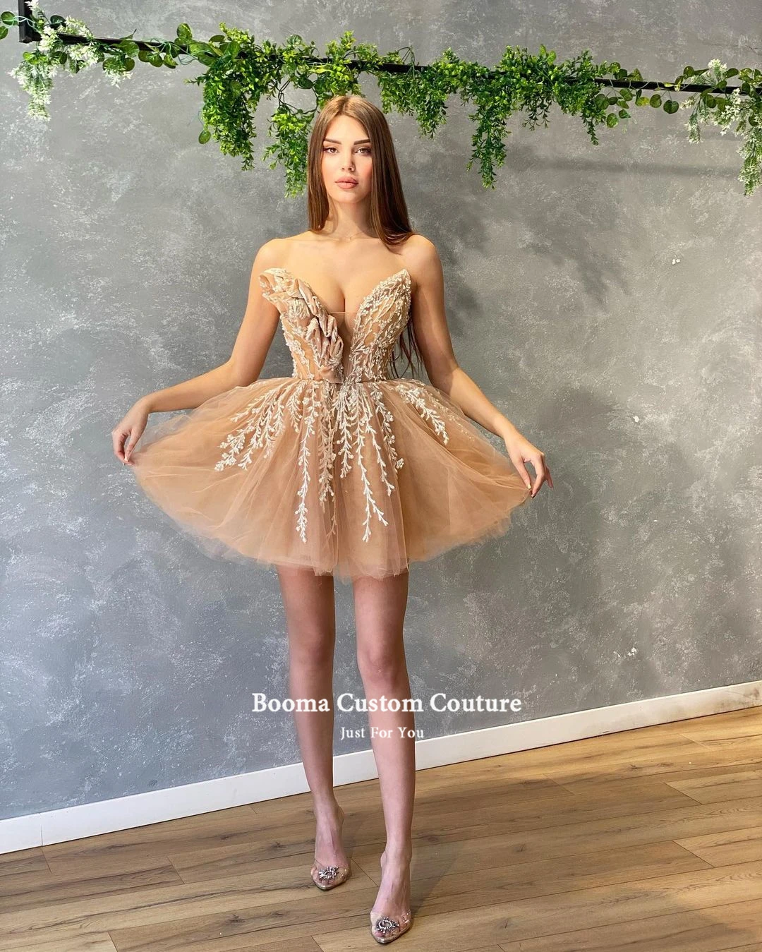 Женское кружевное платье-трапеция Booma, из тюля цвета шампанского, с глубоким V-образным вырезом, без рукавов, с аппликациями, для выпускного вечера, мини-Выпускные платья