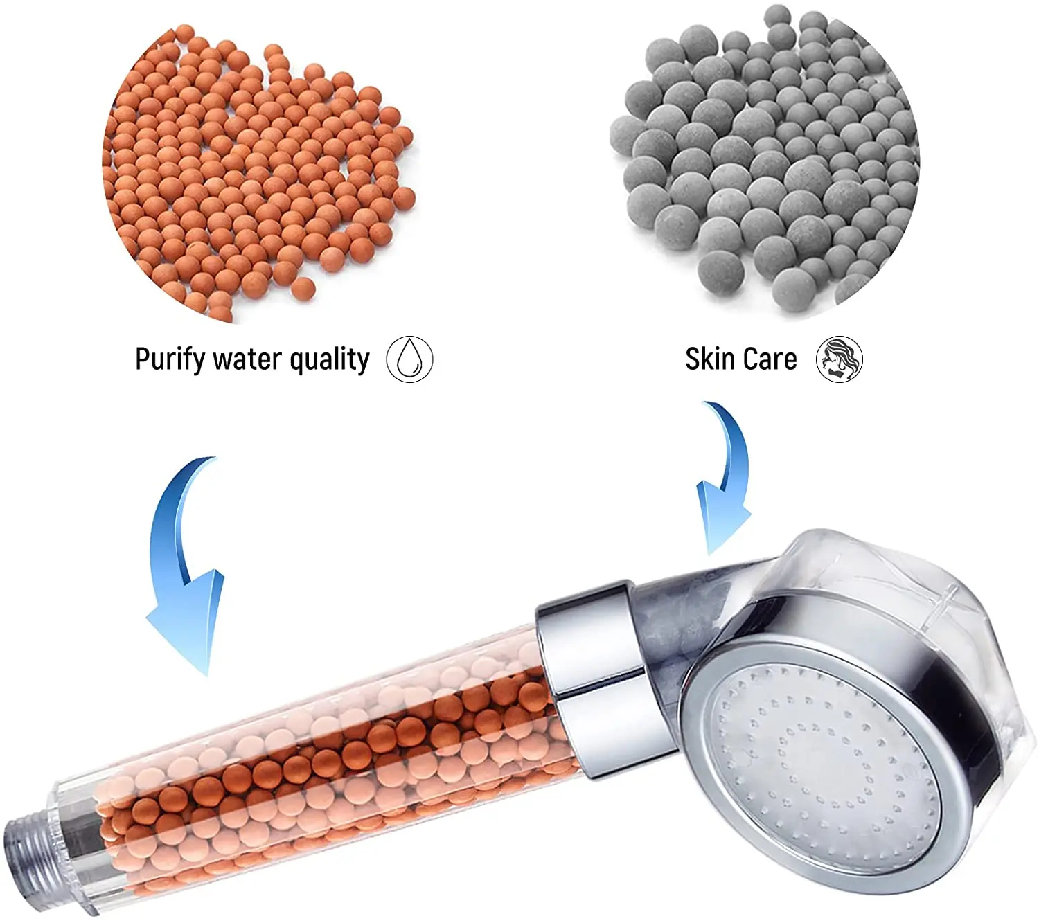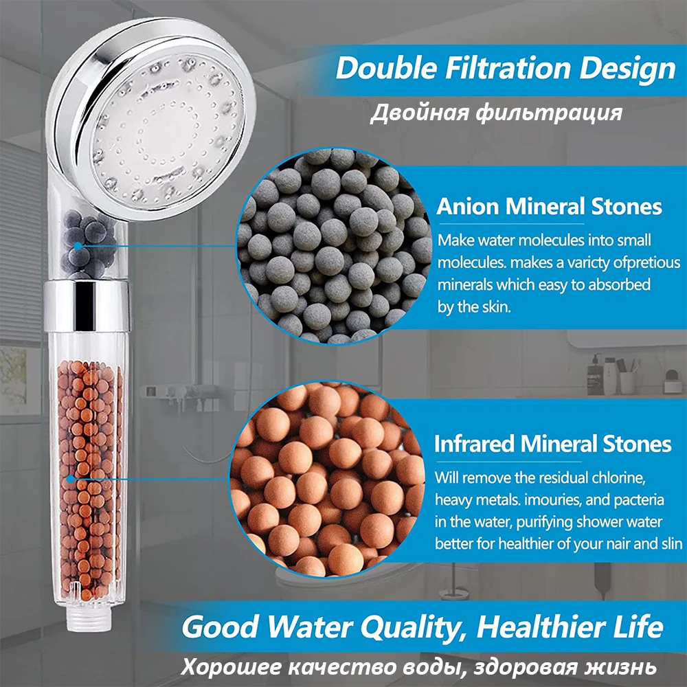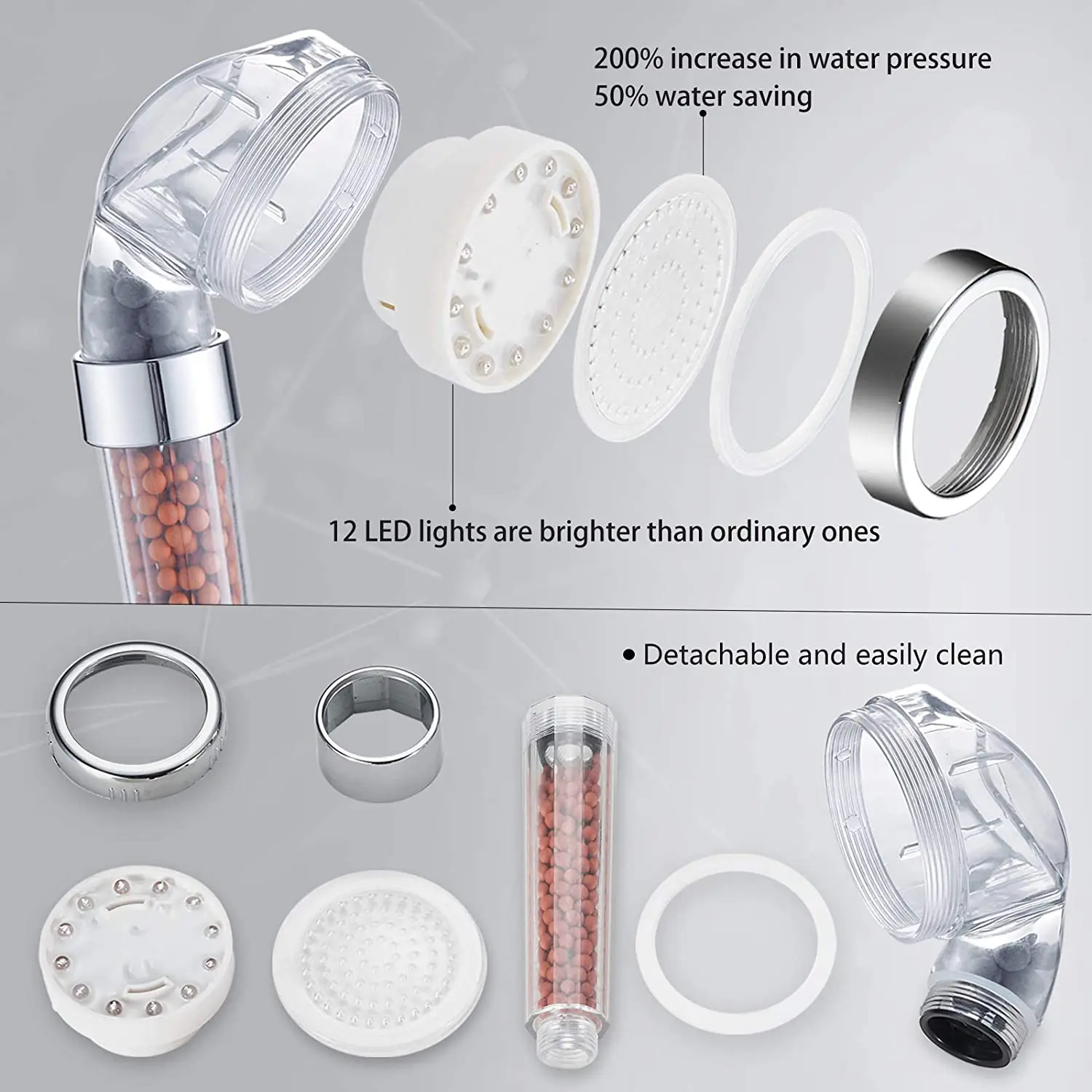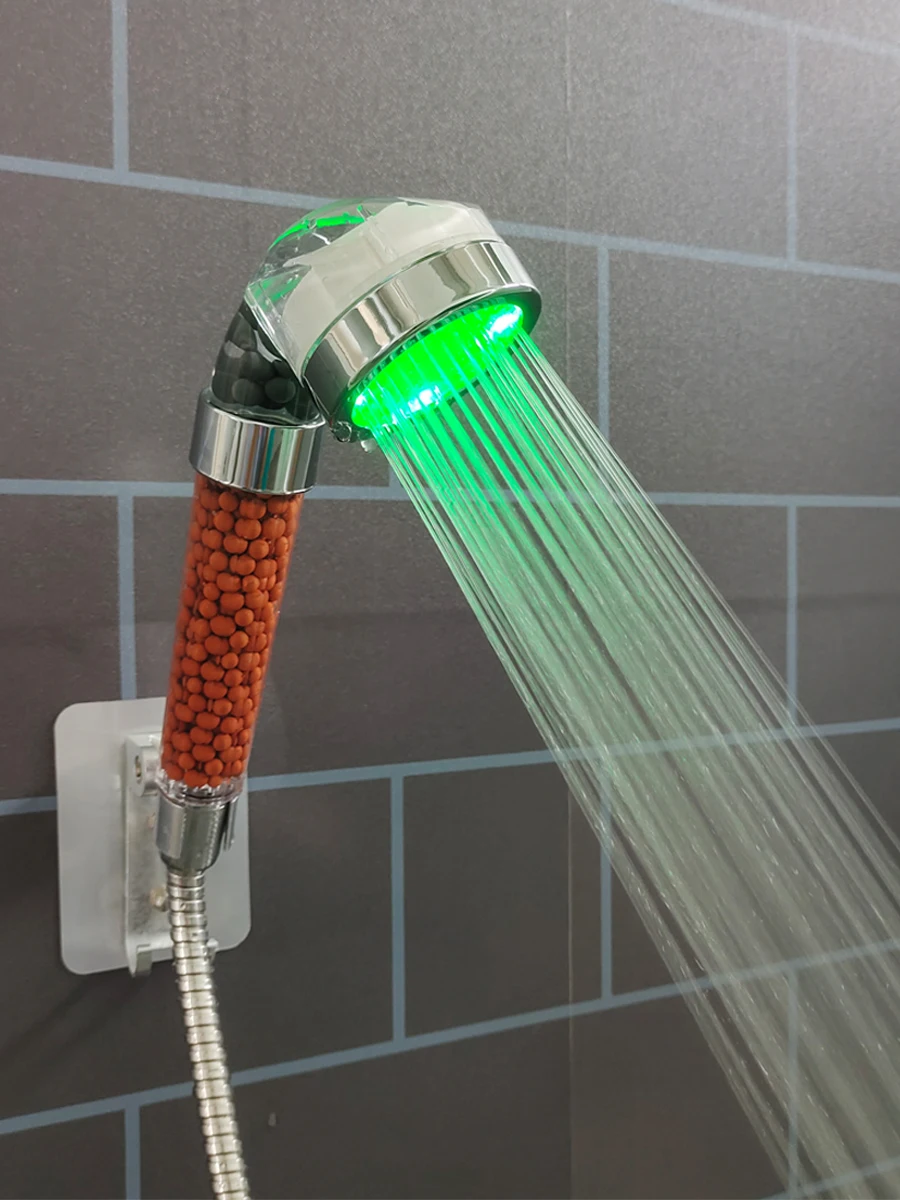 Характеристика:Минеральные шарики могут очищать воду, устранять до 99% вредного хлора и его паров, уменьшать остаточные загрязнения в воде. Улучшает сухость кожи, уменьшает секрецию масла, повышает жизнестойкость клеток, делает кожу более гладкой и Уменьшает выпадение волос.Простота установки: подходит для большинства семей.Душевые головки двух типов:Тип 1: контроль температуры душаОн может менять цвета в зависимости от температуры воды в душе. Только 3 цвета. Когда температура воды достигнет определенного диапазона. Он будет заменен на другой цвет. Зеленый цвет (температура воды <30 ℃/85 ℉), синий цвет (31 ℃-39 ℃/85 ℉-105 ℉), красный цвет (40 ℃-50 ℃/105 ℉-120 ℉)Тип 2: Автоматическая душевая головка разных цветов, без контроля температурыОн может автоматически менять несколько цветов при любой температуре воды.Общая особенность:Оба используют поток воды для получения электричества, без батареи