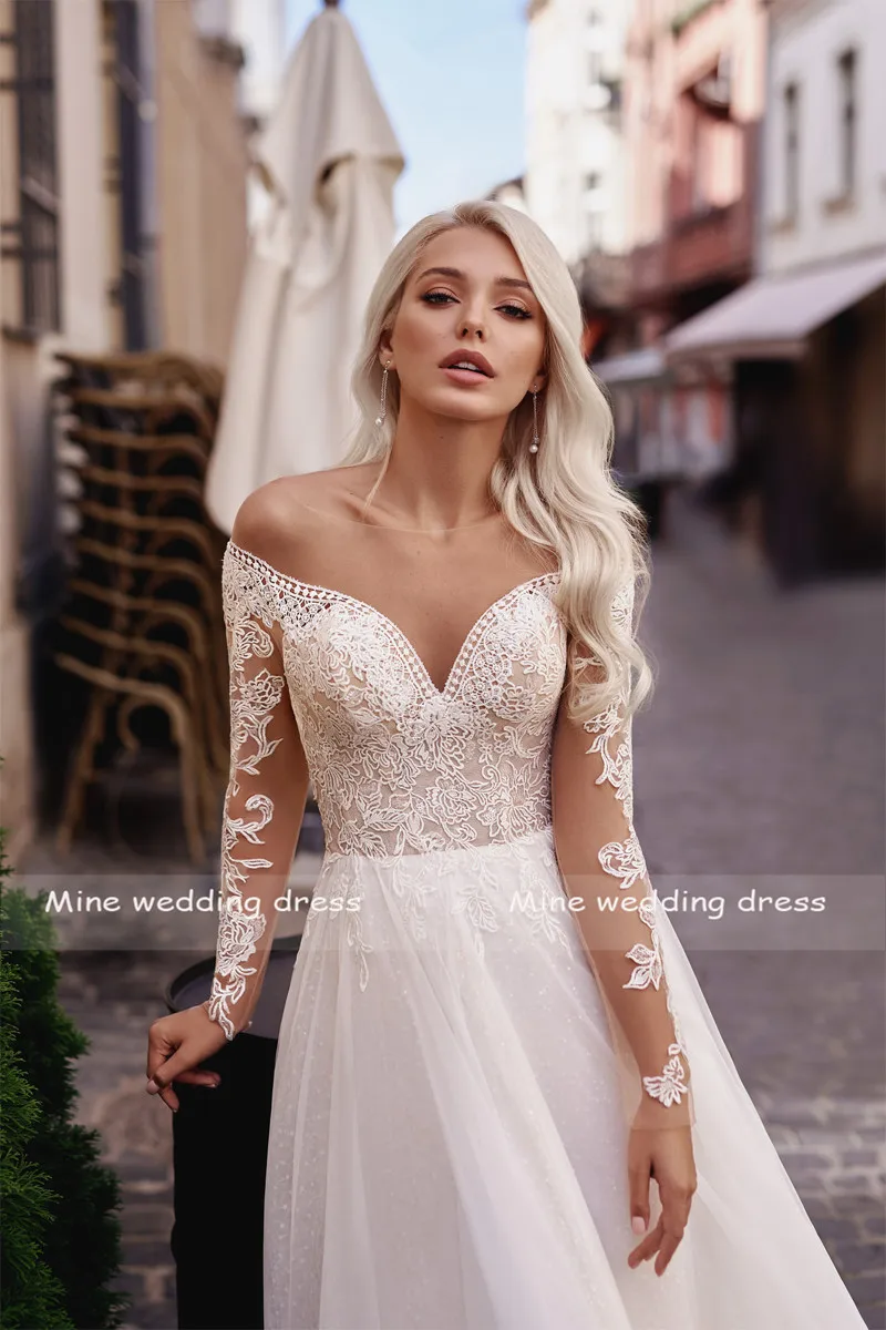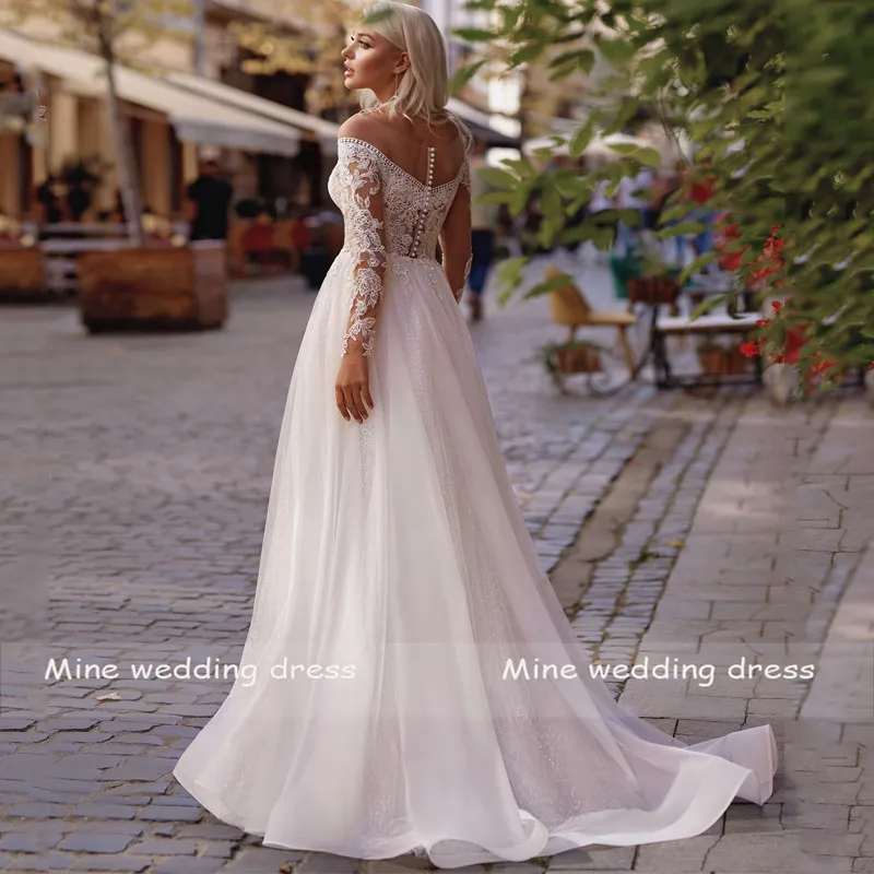 Новый дизайн, блестящее кружевное платье-трапеция из тюля с длинным рукавом, аппликацией из бисера, на пуговицах, свадебное платье, 2021