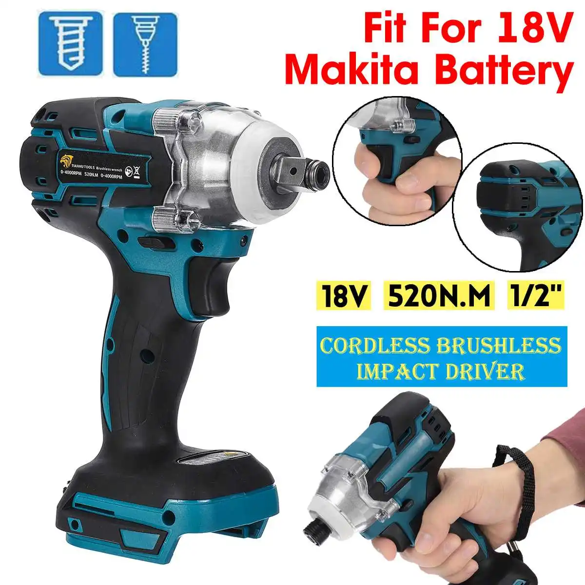 Имя Беспроводной ударный драйвер Батарея Подгонянный к батарее Makita 18V Цвет Черный + синий Скорость без нагрузки 0 - 2700 об/мин Частота удара 0 - 2700 ipm Максимальный крутящий момент 520 нм Квадратный привод 1/2"Особенности
