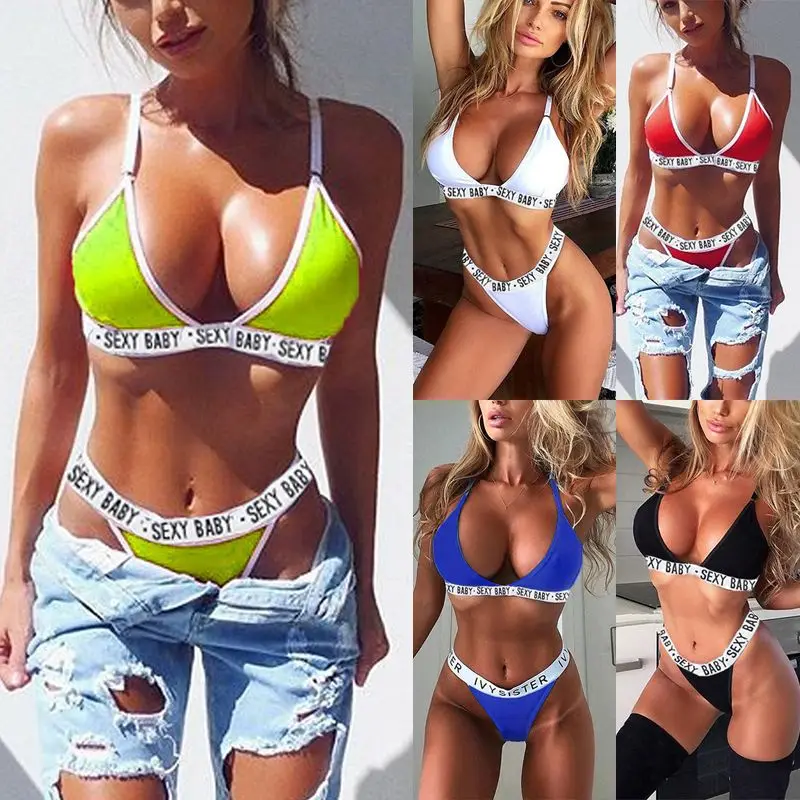 Купальник женский с V-образным вырезом, пикантный мягкий комплект бикини с надписью, с V-образным вырезом, привлекательный элегантный купальник с чашками пуш-ап, на лето