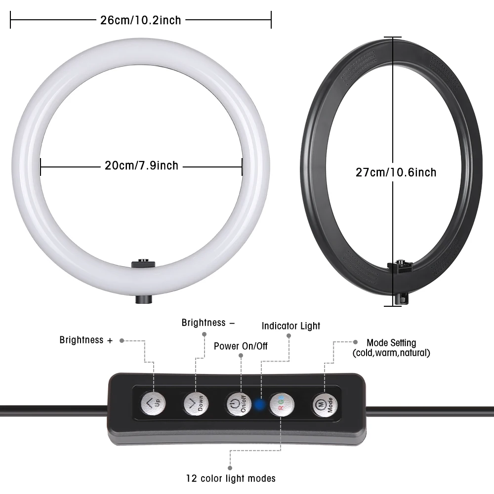 10 дюймов кольцевой светильник: с регулируемой яркостью и регулируется, вы можете отрегулировать светильник влияние от 10%-100%. Кольцевой светильник для селфи делает вас более привлекательным и очаровательным. Специальный светодиодный, легкий и портативный дизайн. Постоянный ток, низкое энергопотребление. Отсутствие ультрафиолетового и инфракрасного излучения светильник излучения, низкая теплоотдача, безопасность и защиту окружающей среды. Многофункциональный тип поддержки: подходит для кольцевой светильник, микрофон, смартфон и камера вращение на 360 °: кольцевой светильник может вращаться на 360 градусов, светильник светится в каждом углу. Usb-разъем питания ed: Кольцевой светильник можно подключить к компьютеру, мобильному питанию и т. д. шаровая Головка и зажим для телефона: подходит для большинства видов смартфонов и мини-подушек. Он может использоваться для наружной фотосъемки светильник, заполняющий светильник в помещении, портрет, мода, свадебное искусство, рекламная фотография, съемка видео и т. Д.