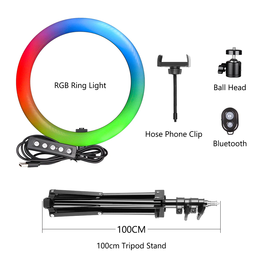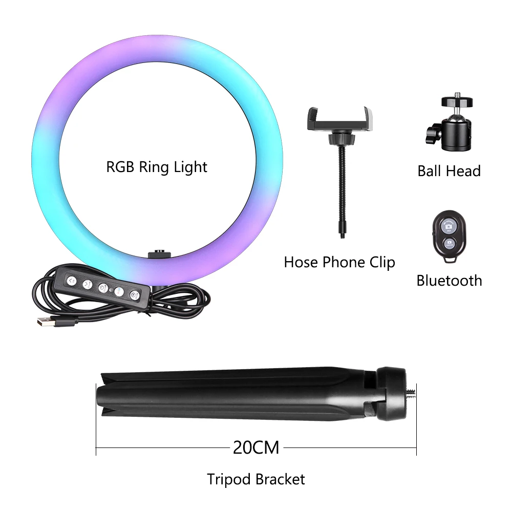1x10 дюймов кольцевой светильник1 x зажим для телефона1x20 см Настольный ШтативШаровая Головка-1 шт.1 x Bluetooth