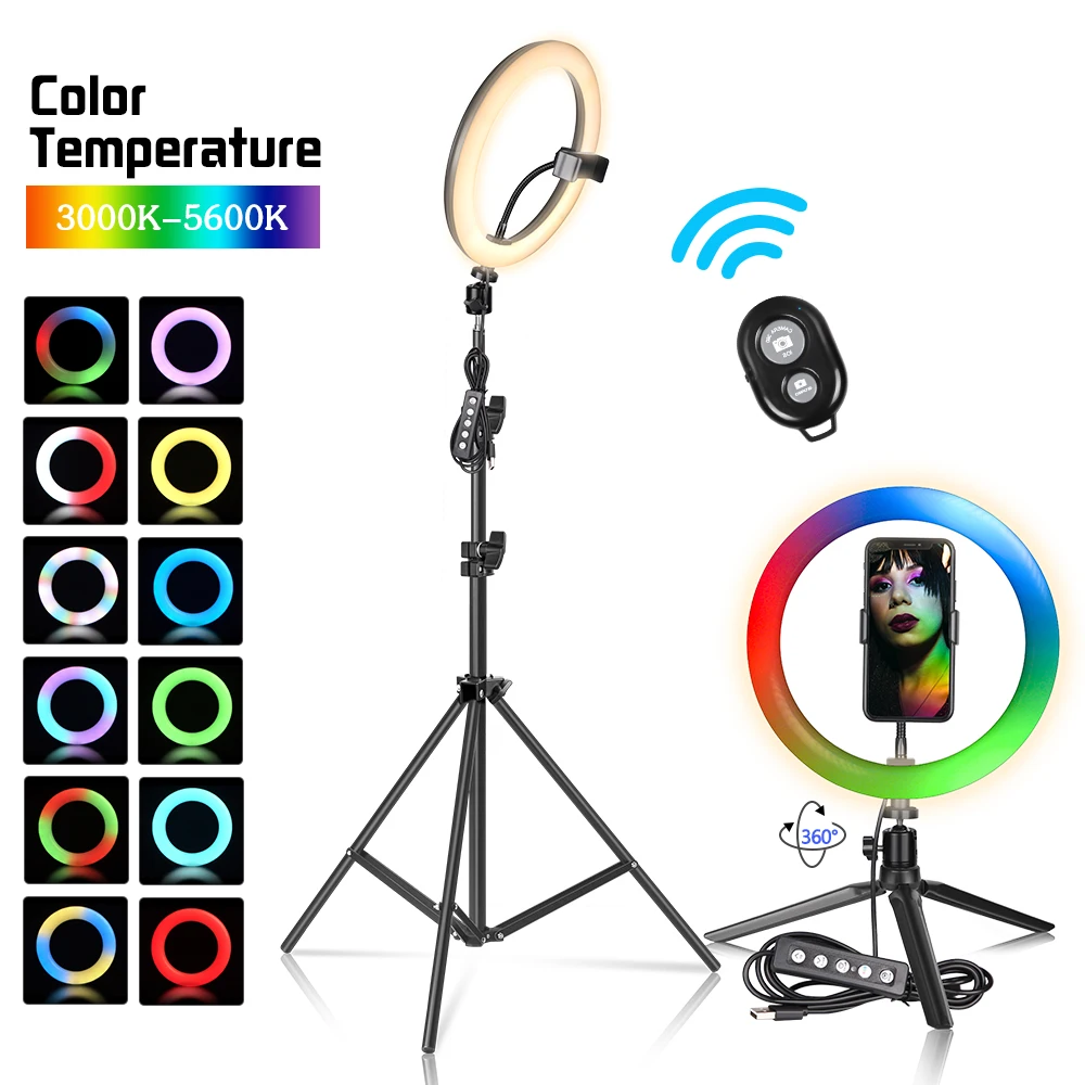 Кольцевой светильник для макияжа, 10-дюймовая RGB лампа для селфи со штативом и держателем для телефона, с дистанционным управлением, с регулируемой яркостью, 15 режимами мигания, для макияжа