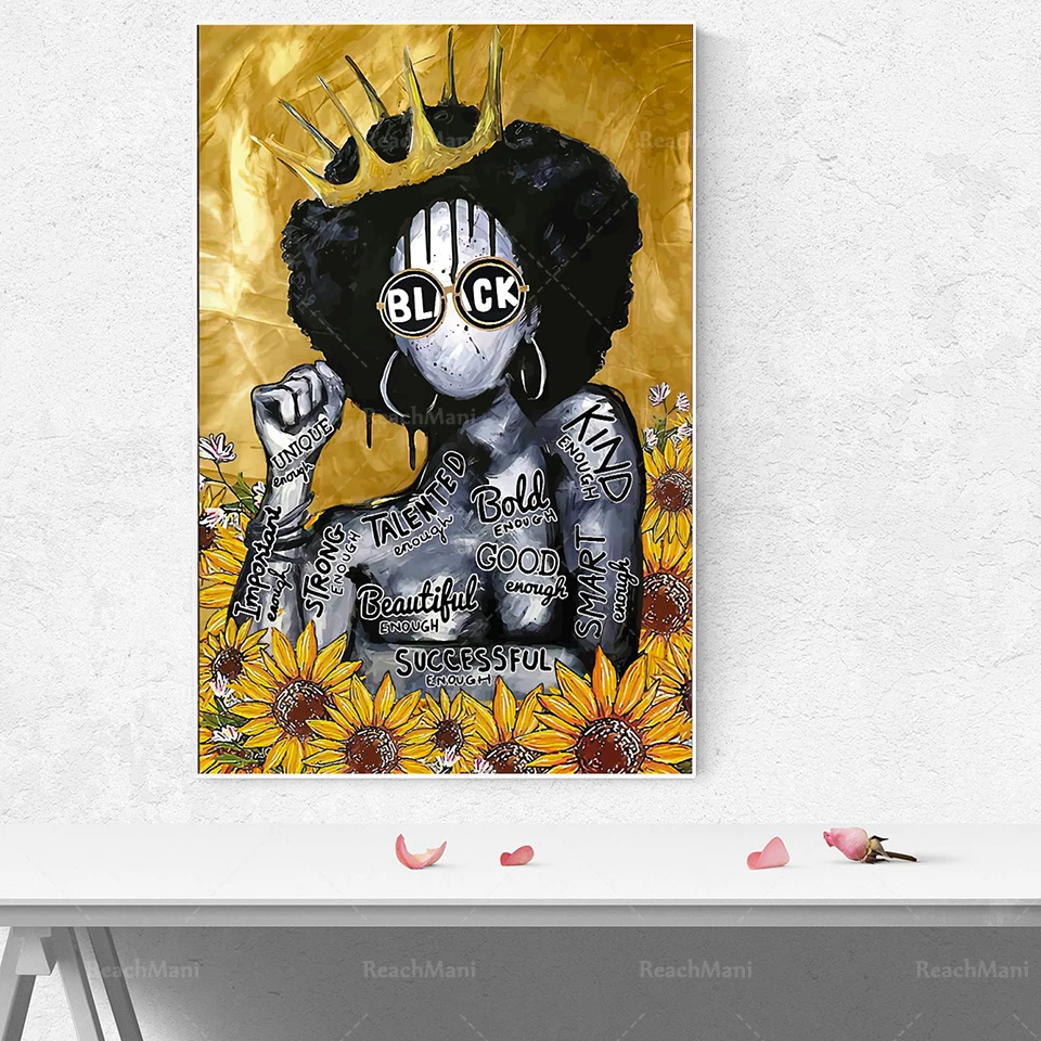 Волшебный плакат для черной девочки, плакат с черной силой, плакат афроамериканский, черное искусство, Цветочная голова, неостанавливаемая роспись, вывеска
