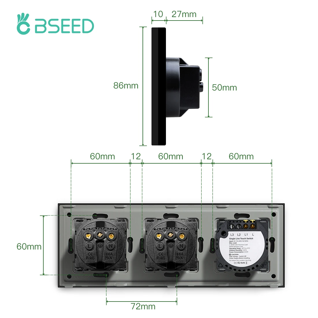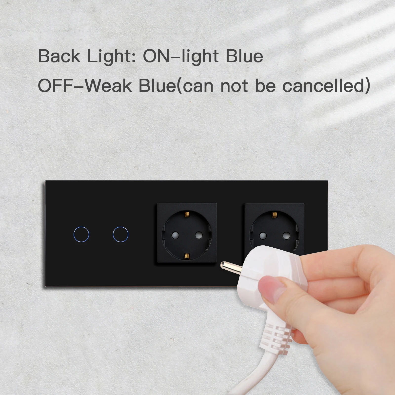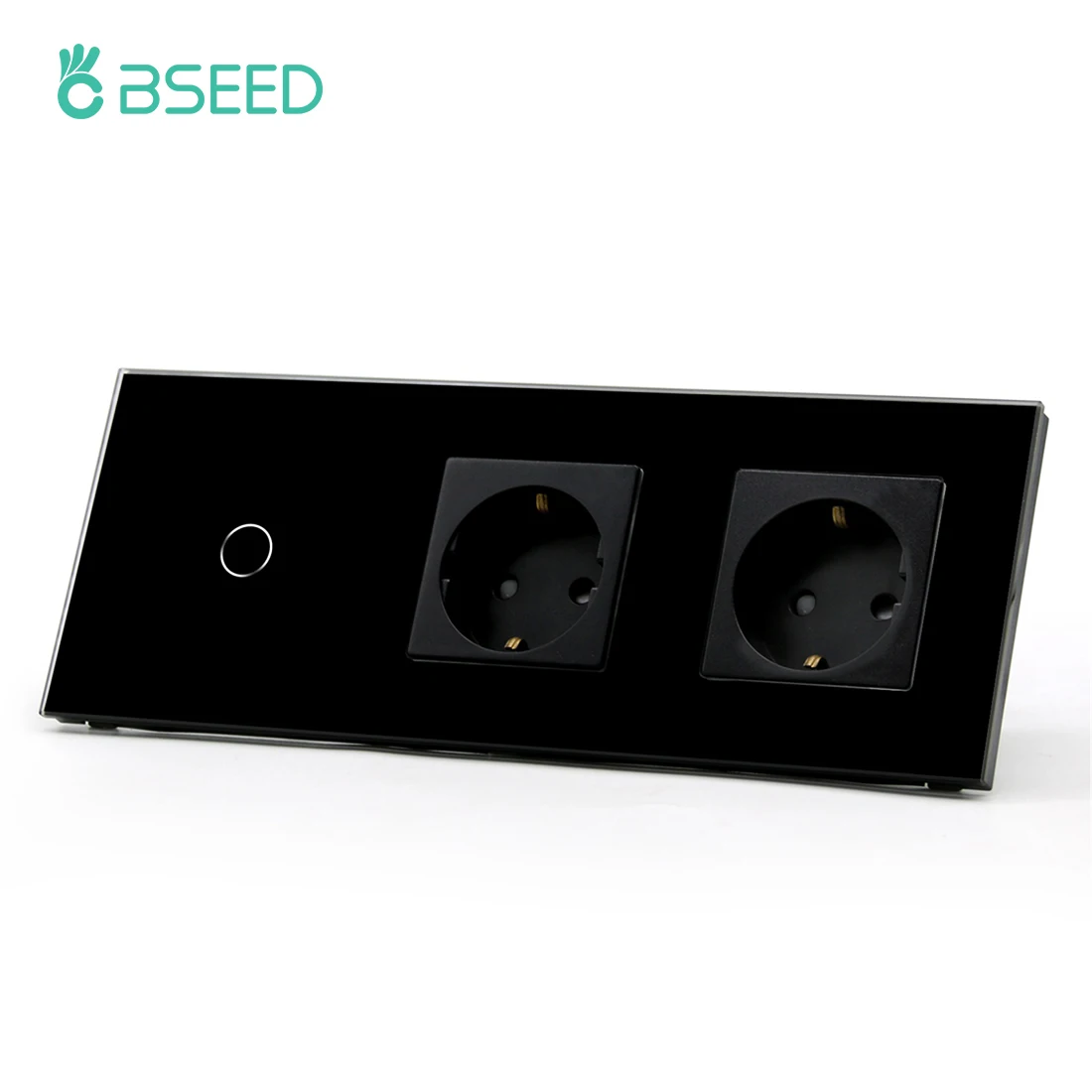 Сенсорный выключатель BSEED, настенный светильник23 клавиши, 1 канал, прозрачное стекло, черный переключатель с европейской двойной розеткой