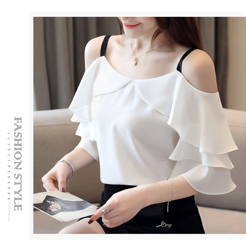 Блузка женская с открытыми плечами, модная шифоновая рубашка с коротким рукавом, Белый Топ, E766, лето 2021