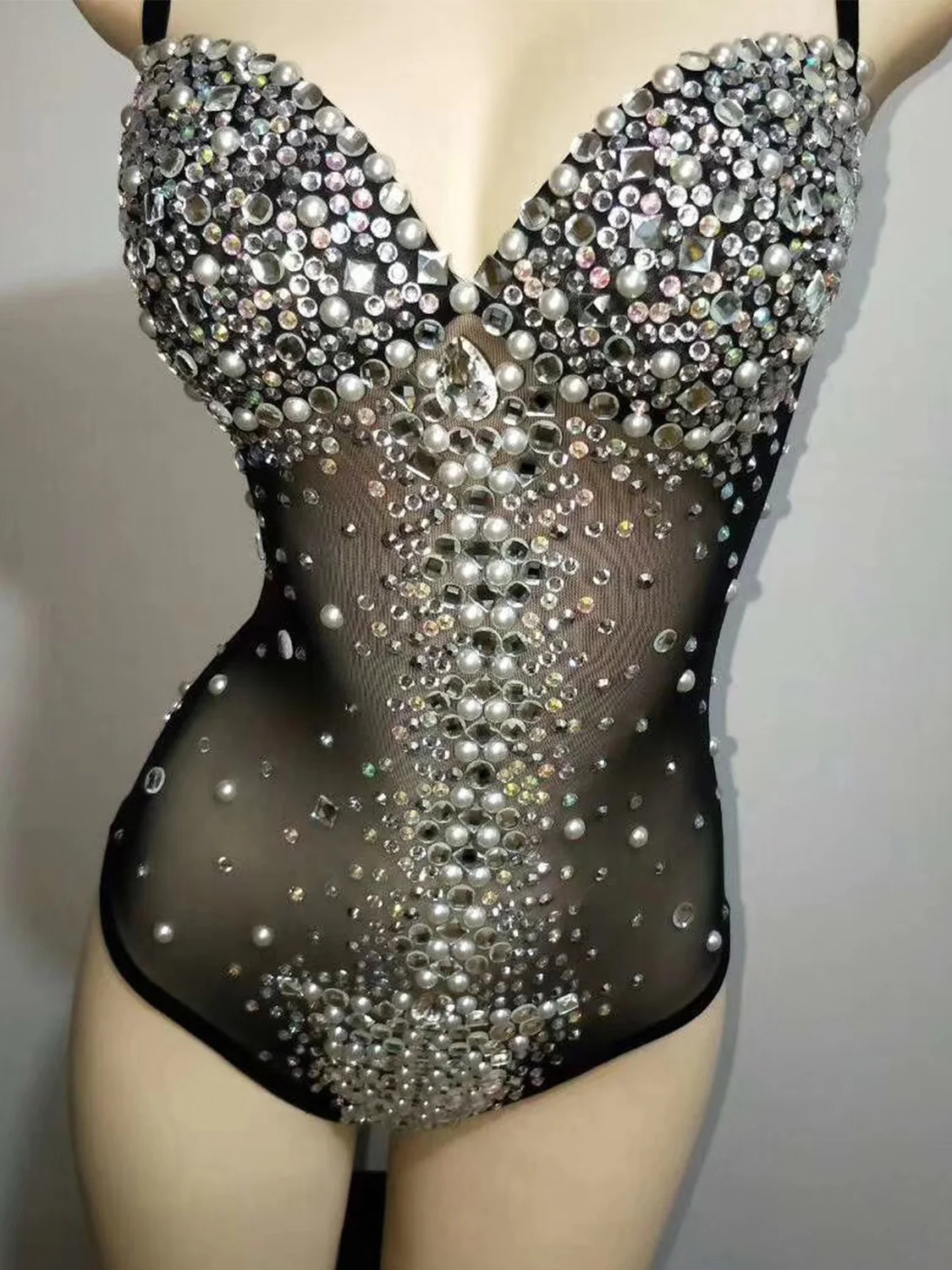 Блестящими бриллиантами и жемчугом без рукавов боди для Танцы одежда для сцены черное ночное белье костюмы танцовщицы, выпускной вечер, трико