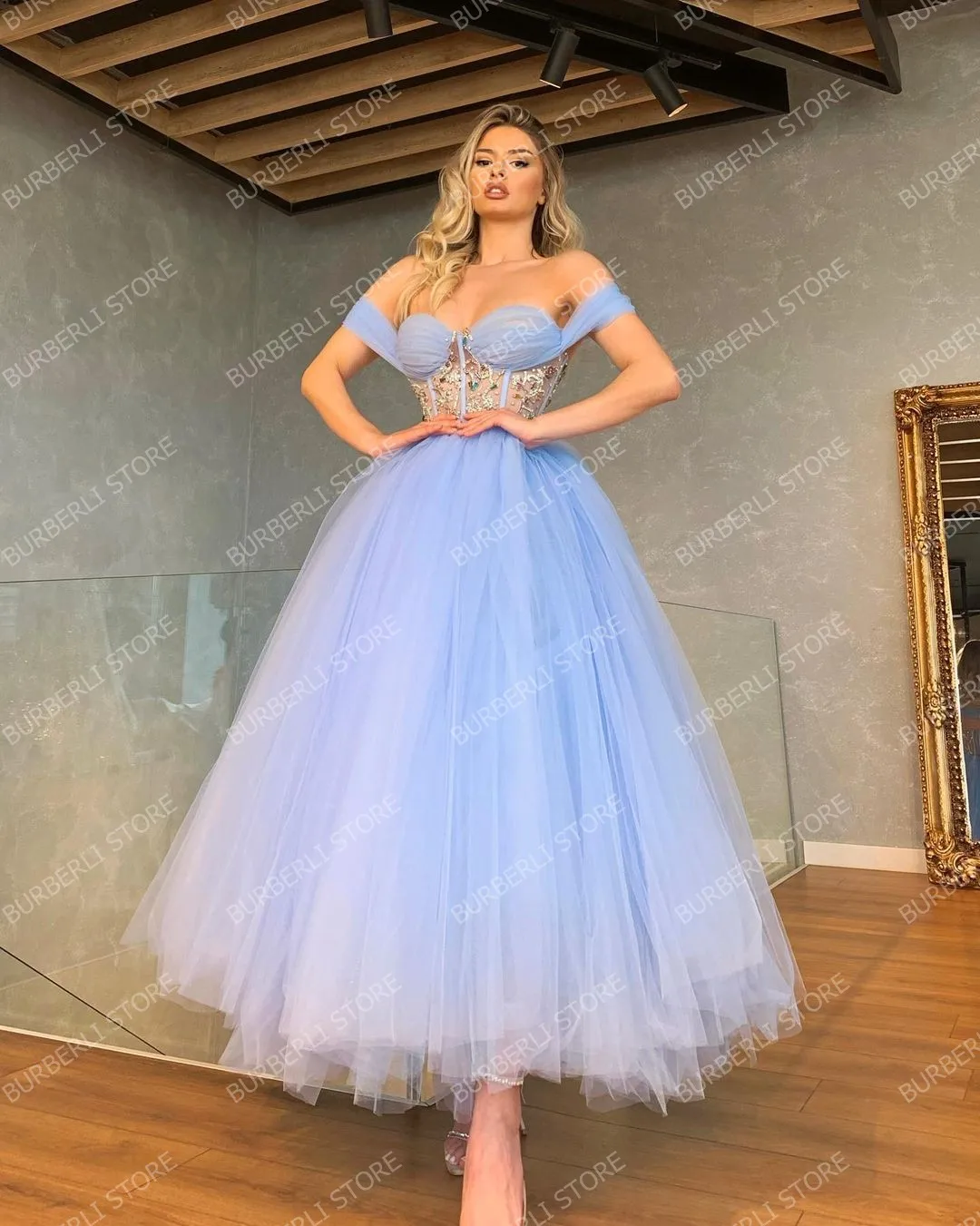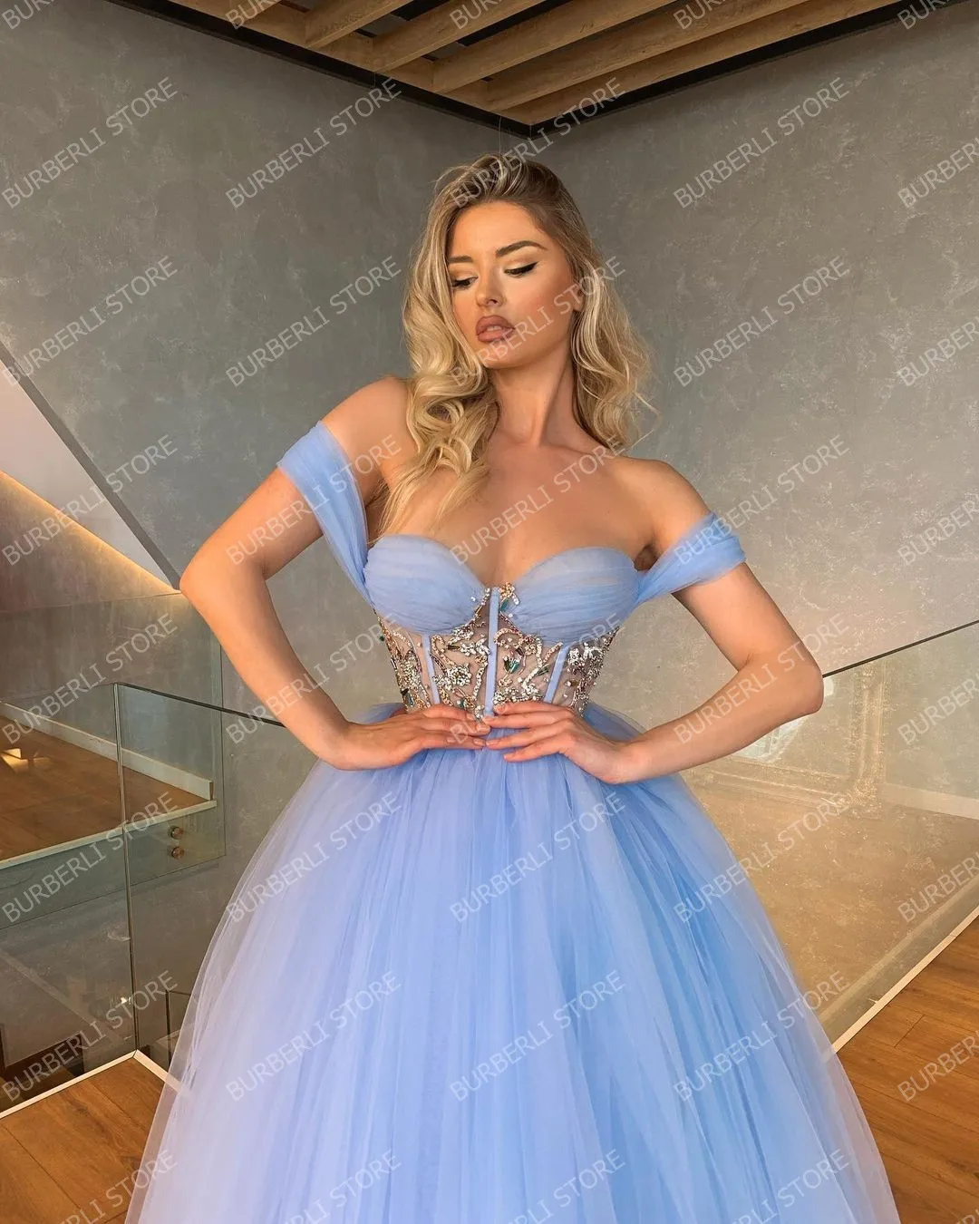 Очень пушистое светильник-голубое Тюлевое платье А-силуэта милое платье с открытыми плечами с бисером Ceystals Формальные вечерние платья в форме Sukoenki