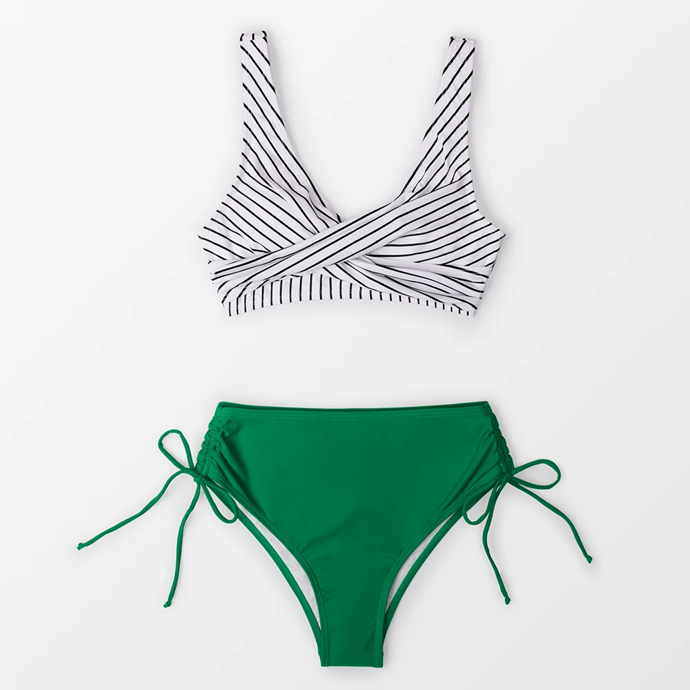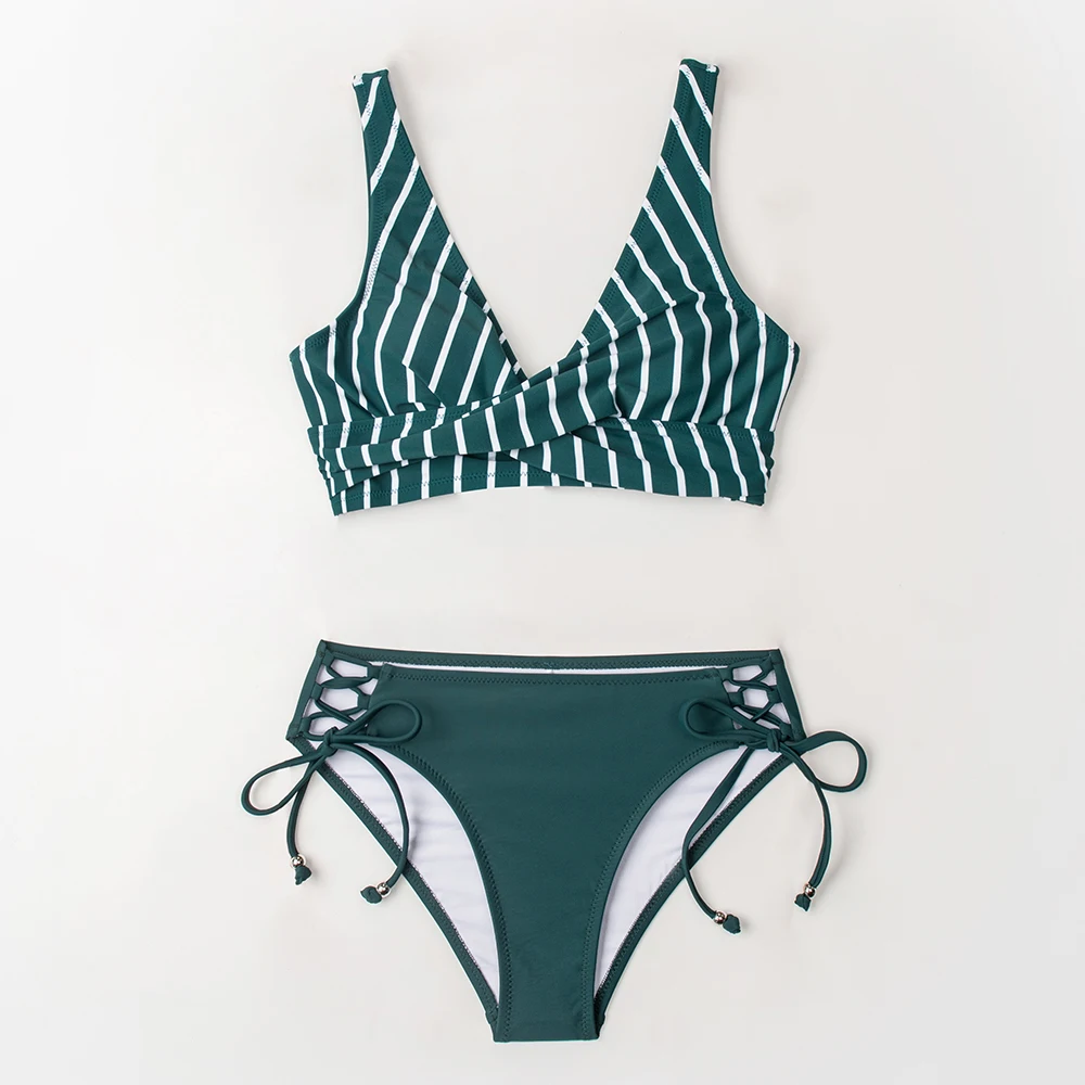 Женский раздельный купальник с принтом, Раздельный купальник со средней талией, однотонный, на шнуровке, пляжный стиль, 2021