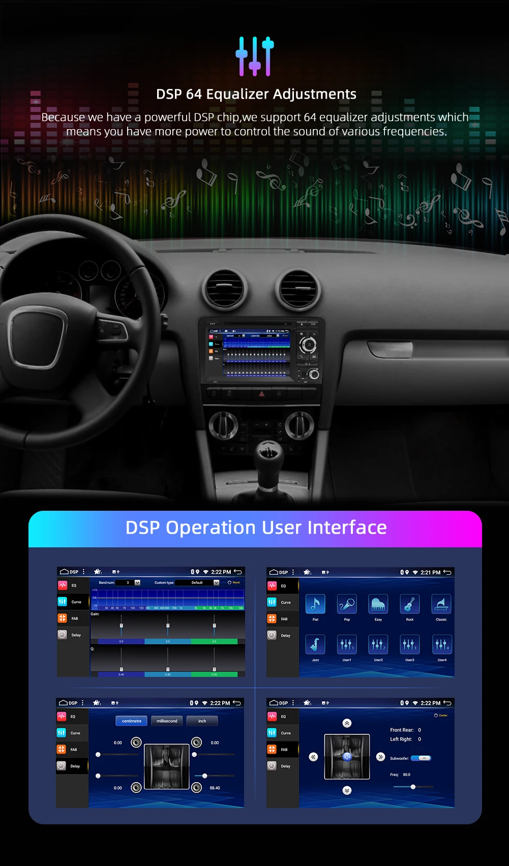 ▲Встроенный DSP(64EQ), встроенный Carplay, поддержка Dab + Радио, зеркальная ссылка и оригинальная функция управления рулевого колеса автомобиля, USB & micro SD до 500 Гб, встроенный WiFi Интернет, google Maps онлайн навигация, Бесплатная автономная навигация по карте, Google Play Store