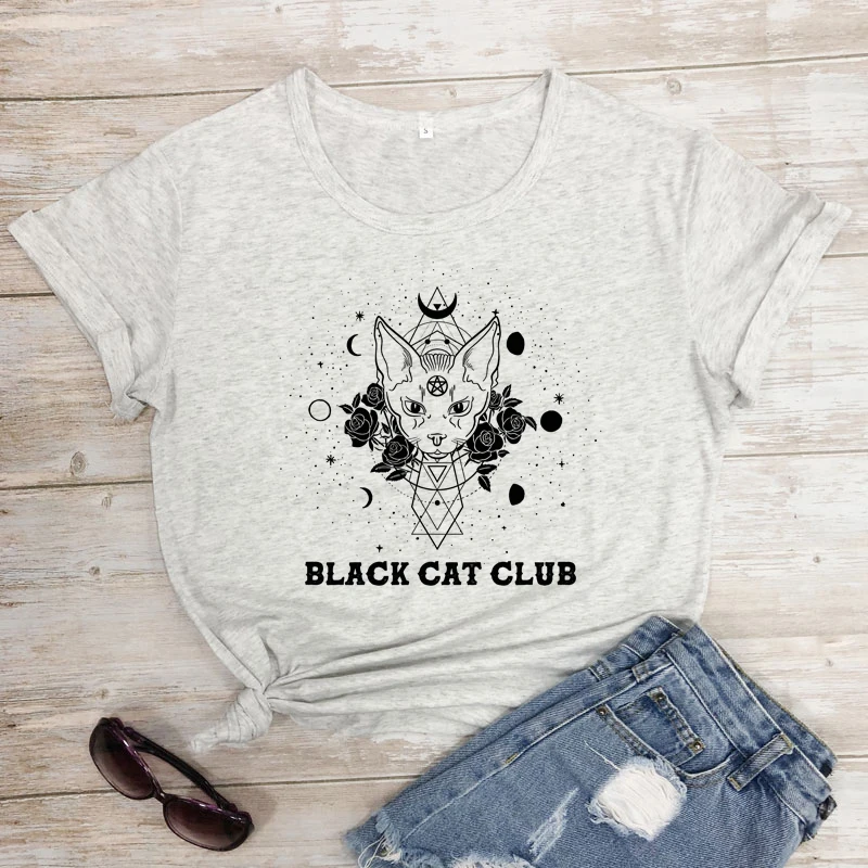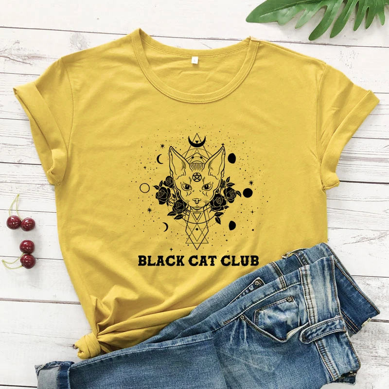 Черная кошка клуб 100% хлопковая Футболка Готический кошка Сфинкс подарок футболка эстетику для женщин в стиле бохо; Фазы Луны являются элементами в готическом стиле топ, футболка, рубашка