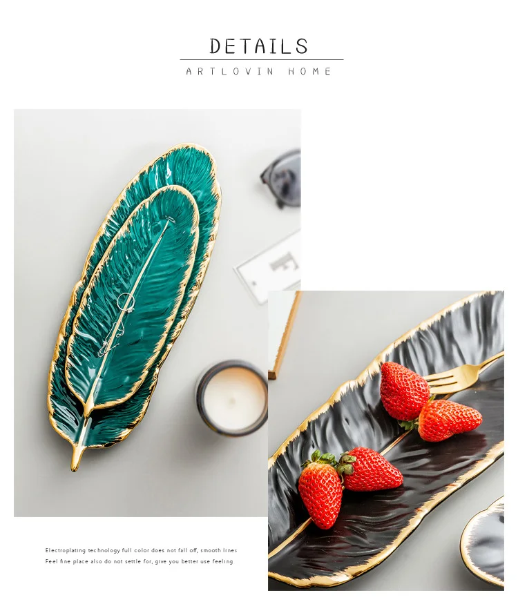 Керамический позолоченный поднос для хранения фруктового торта, посуда, тарелка в форме листа, пера, органайзер для косметики украшений, настольное украшение