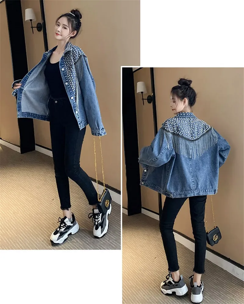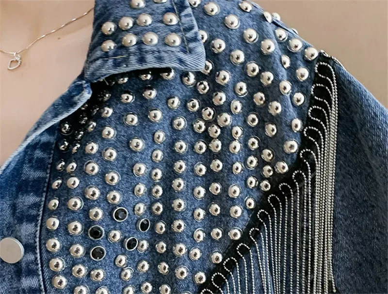 2021 новые осенние женские джинсовые куртки ручной работы со стразами, заклепками и бахромой; Пальто женский джинсовый жакет свободные куртки черного цвета Верхняя одежда размера плюс