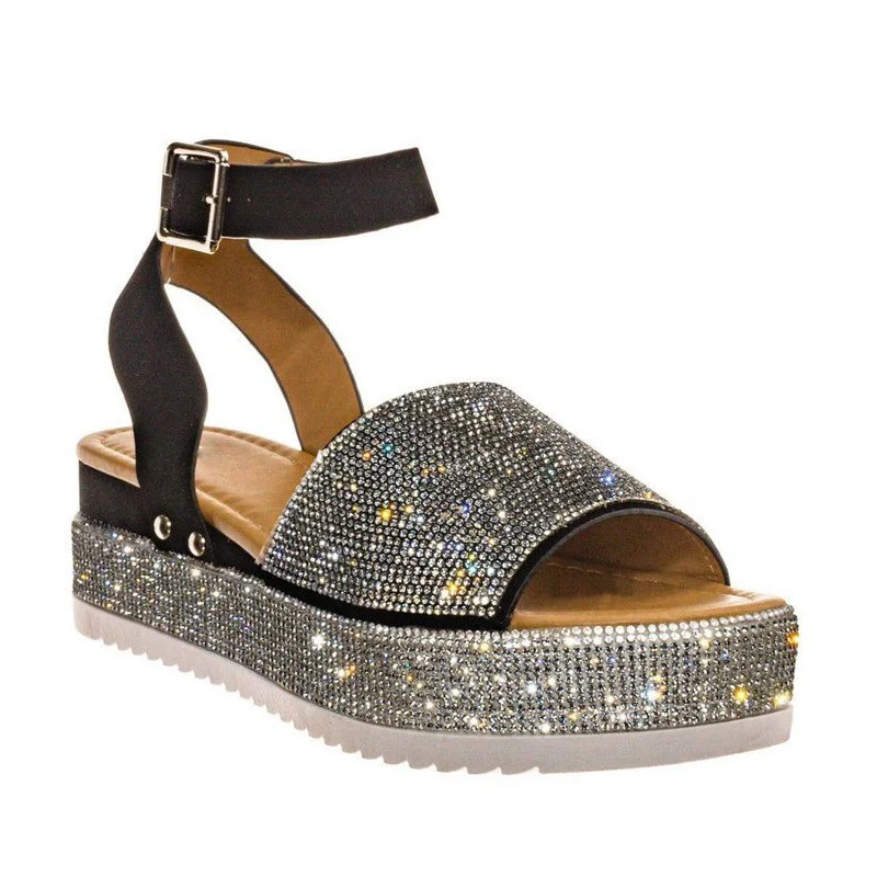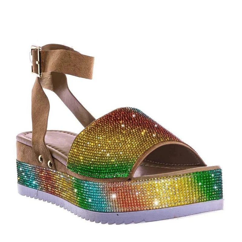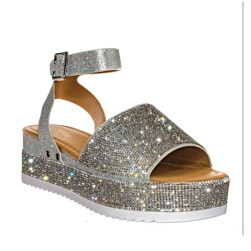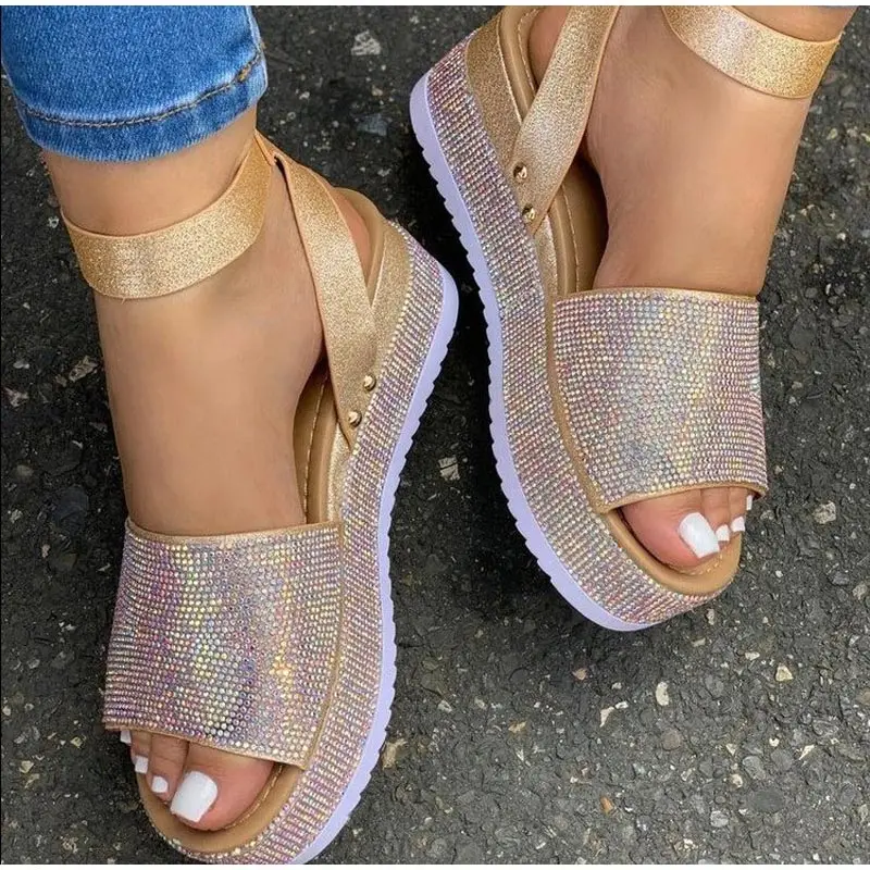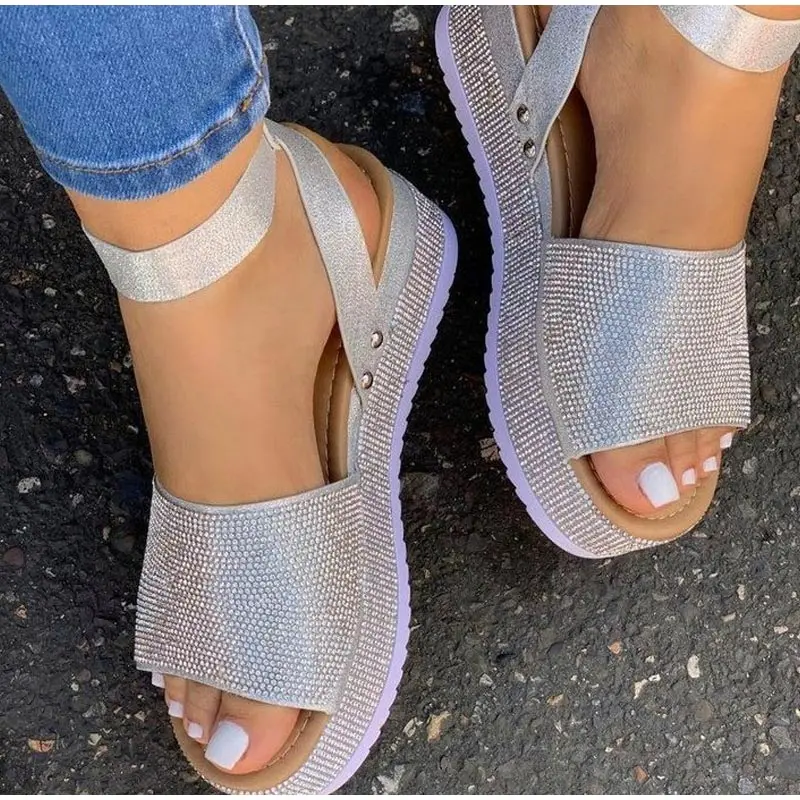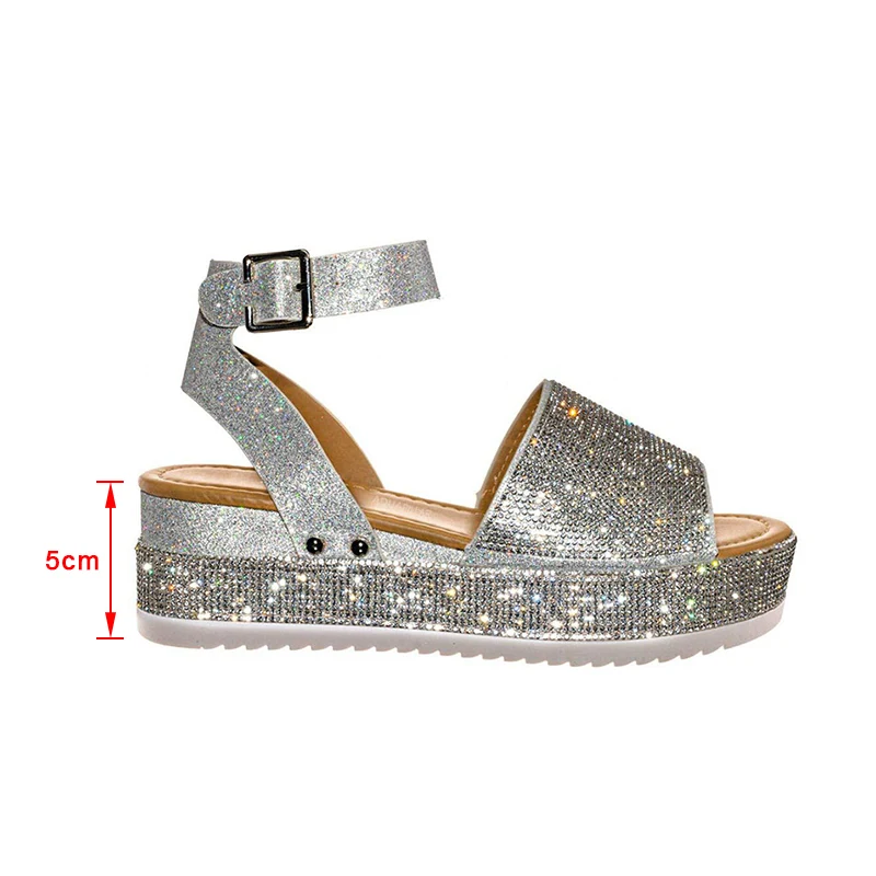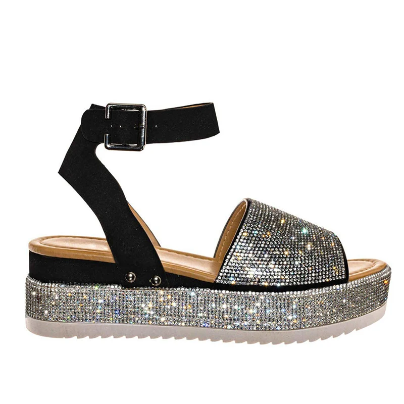 2021 летние женские сандалии со стразами; Модная женская обувь со стразами; Женская обувь на толстой подошве с пряжкой; Женская обувь с открытым носком